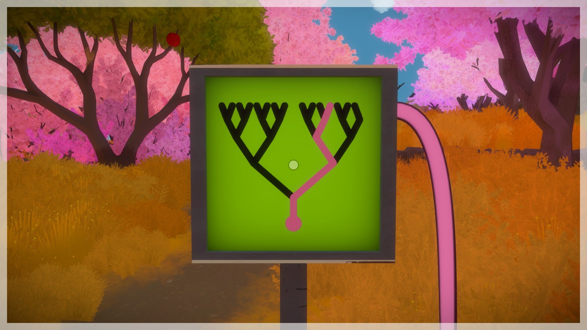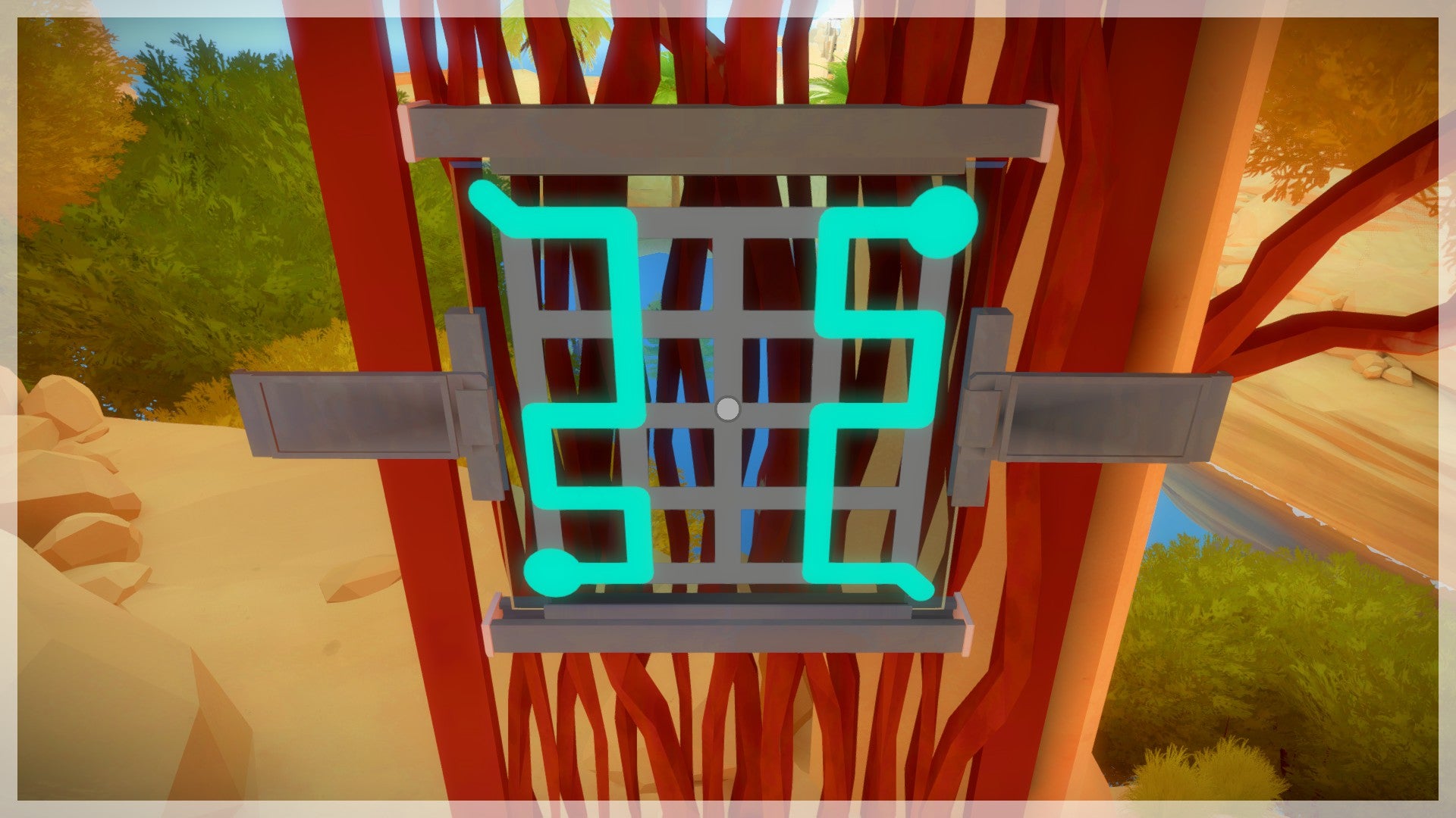 Keer terug naar het begin van roze bomen en volg het linkse pad links tot je bij water en een gebouw met een rode deur komt. Open de deur door de puzzel op te lossen. Helemaal achteraan in het gebouw vind je vijf schermen. Je maakt kennis met een nieuwe variant op de voorgaande puzzels. De lijn die je trekt wordt automatisch gespigeld. Om deze puzzels op te lossen moet je beide symmetrische lijnen van het begin naar het eindpunt leiden.