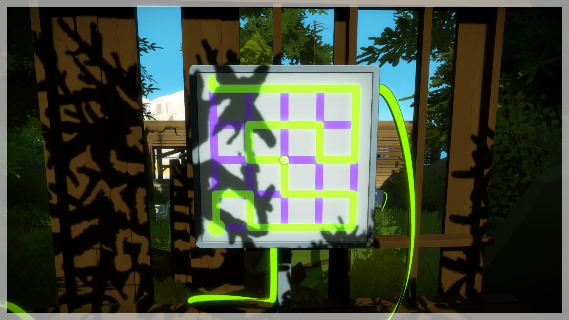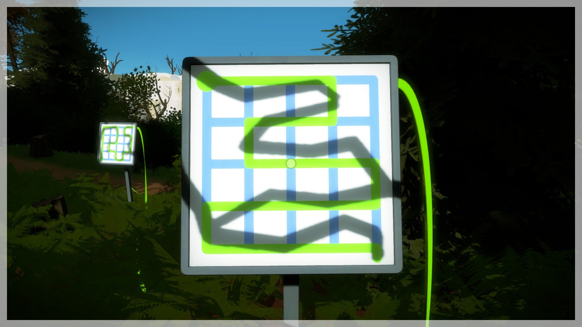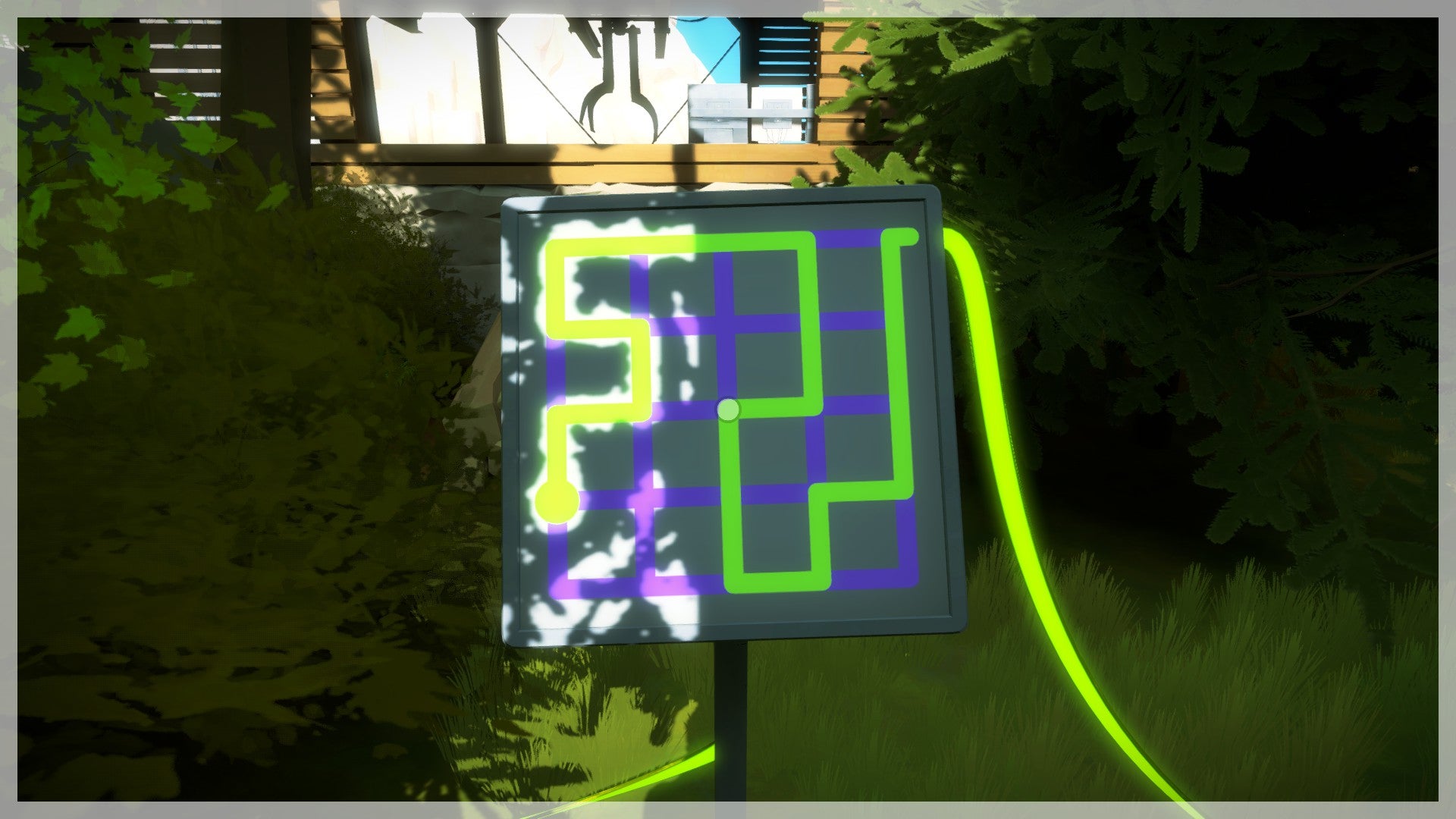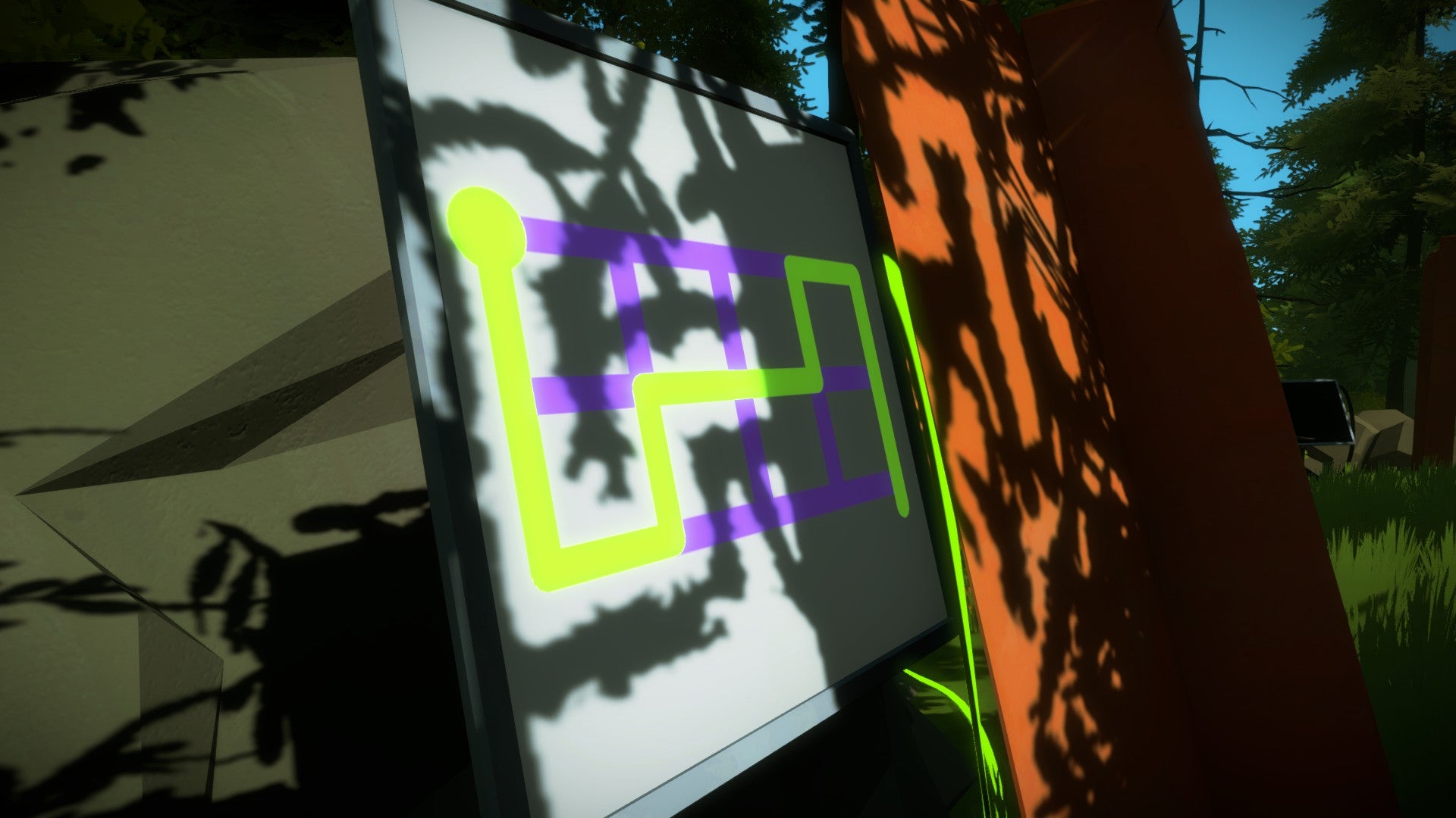 De volgende puzzels vind je dieper in het bos. Volg de geactiveerde kabel. Je komt bij een puzzel die half is afgedekt. Als je goed naar de roestige plaat kijkt, zie je een duidelijk lichttunnel die je op het scherm moet volgen. In feite gaat het dus om exact hetzelfde principe als daarnet, alleen valt de schaduw niet meer rechtstreeks netjes op het scherm maar moet je deze van de omgeving afleiden. Hetzelfde principe geldt ook voor de twee volgende puzzels. Hou voldoende afstand van de scherm en probeer deze vanop een afstand te bedienen om het overzicht te bewaren.
