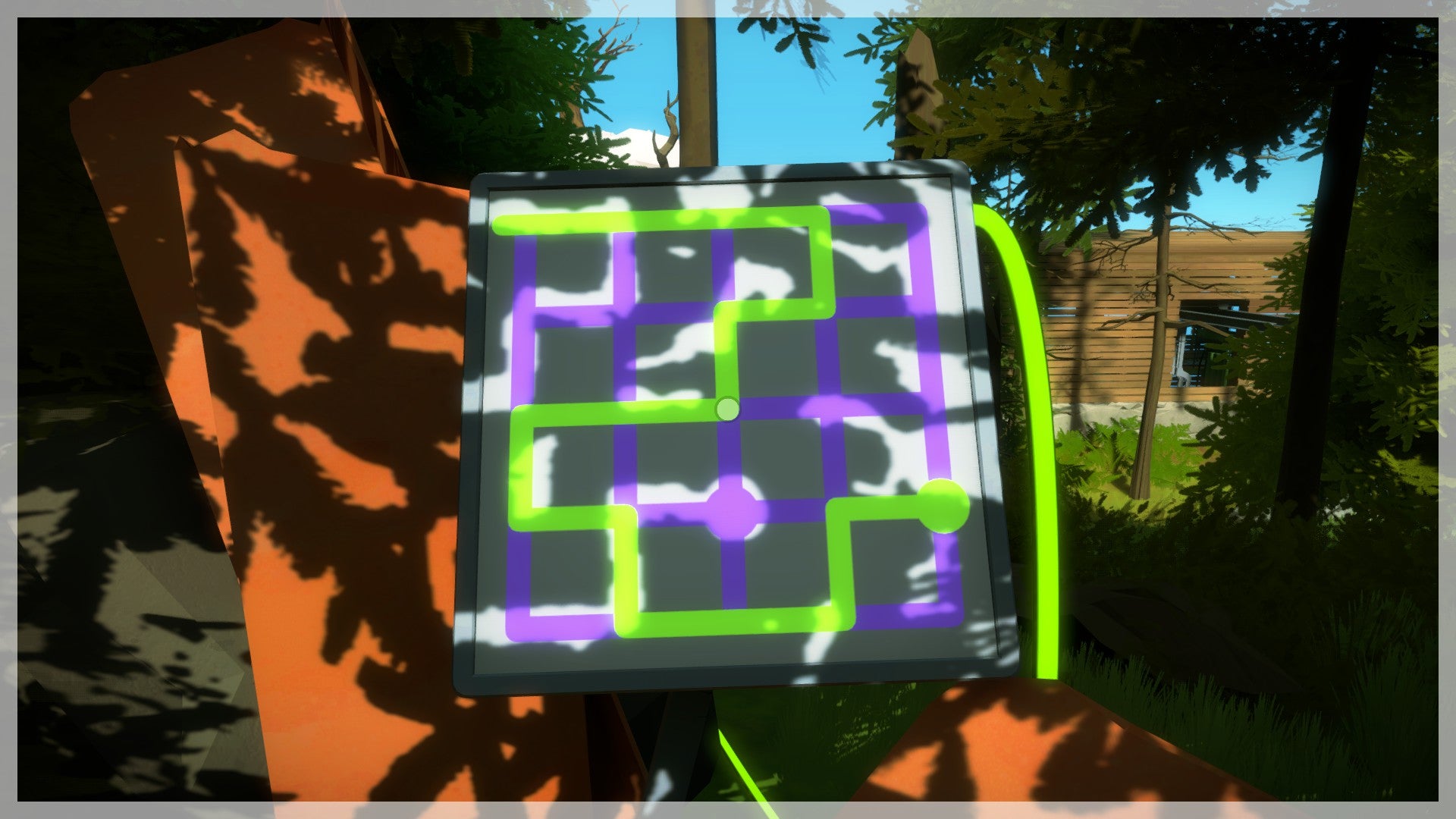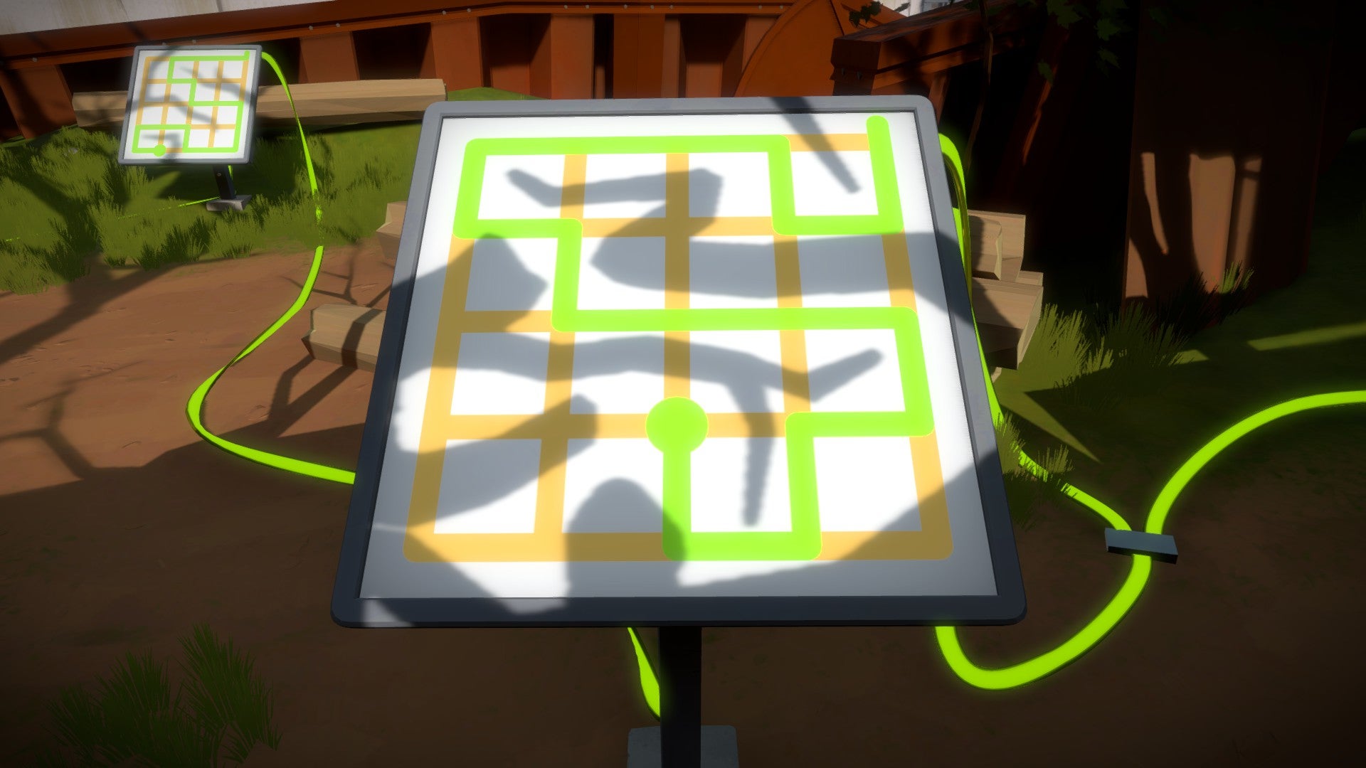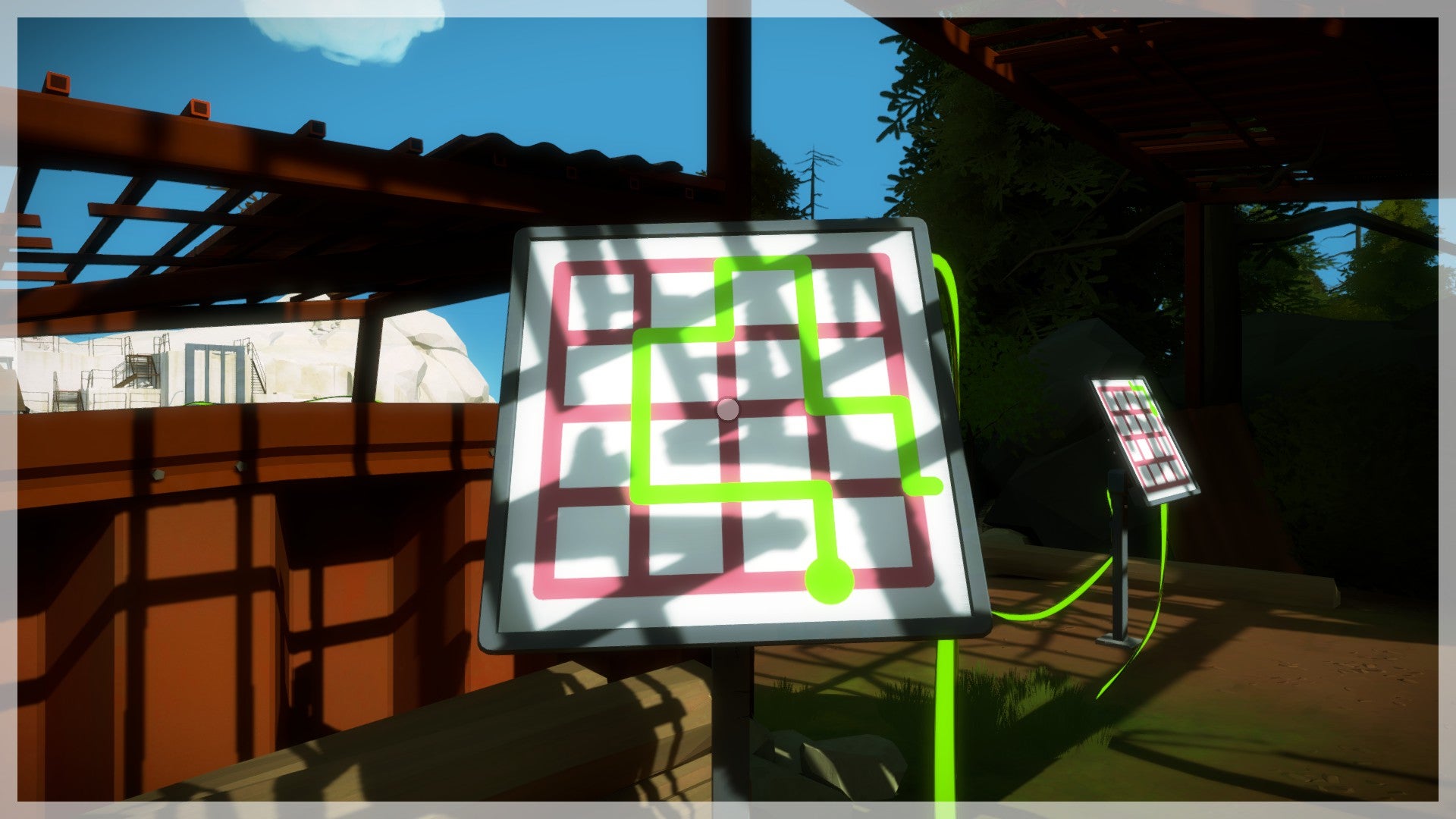 De volgende puzzels vind je dieper in het bos. Volg de geactiveerde kabel. Je komt bij een puzzel die half is afgedekt. Als je goed naar de roestige plaat kijkt, zie je een duidelijk lichttunnel die je op het scherm moet volgen. In feite gaat het dus om exact hetzelfde principe als daarnet, alleen valt de schaduw niet meer rechtstreeks netjes op het scherm maar moet je deze van de omgeving afleiden. Hetzelfde principe geldt ook voor de twee volgende puzzels. Hou voldoende afstand van de scherm en probeer deze vanop een afstand te bedienen om het overzicht te bewaren.