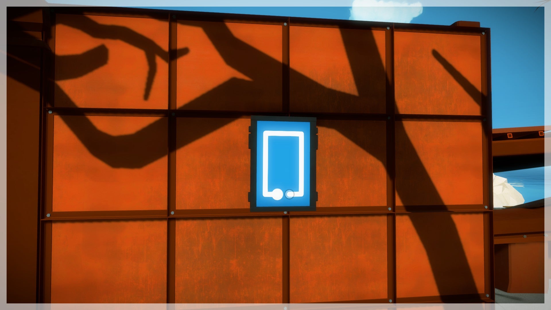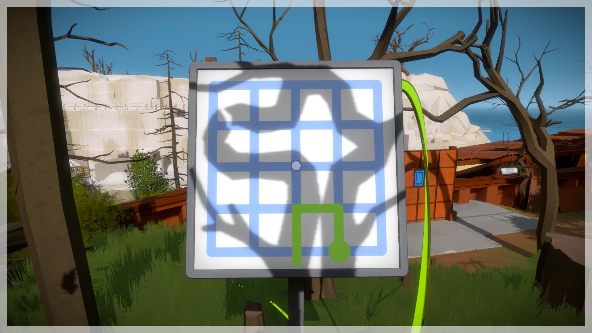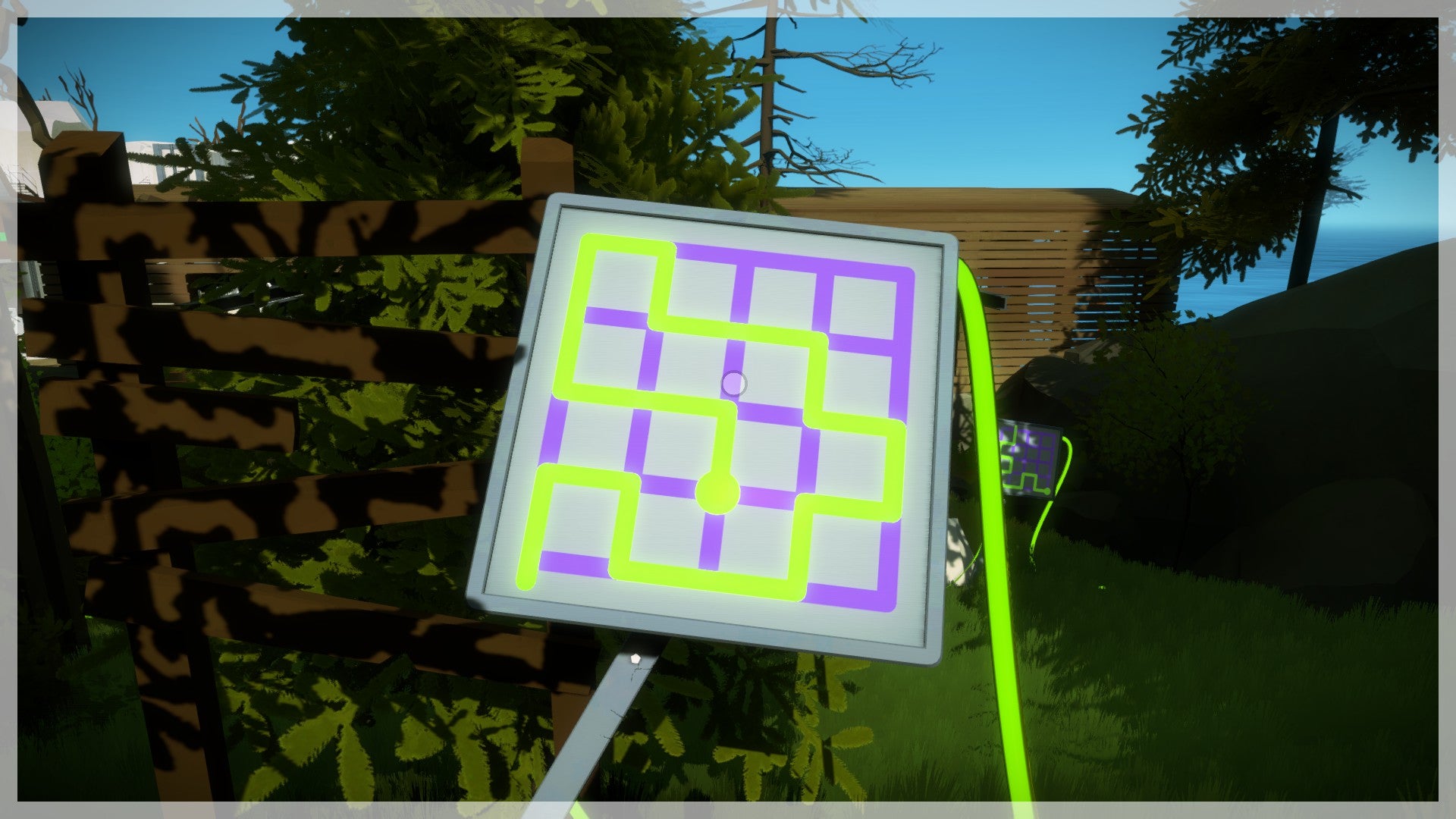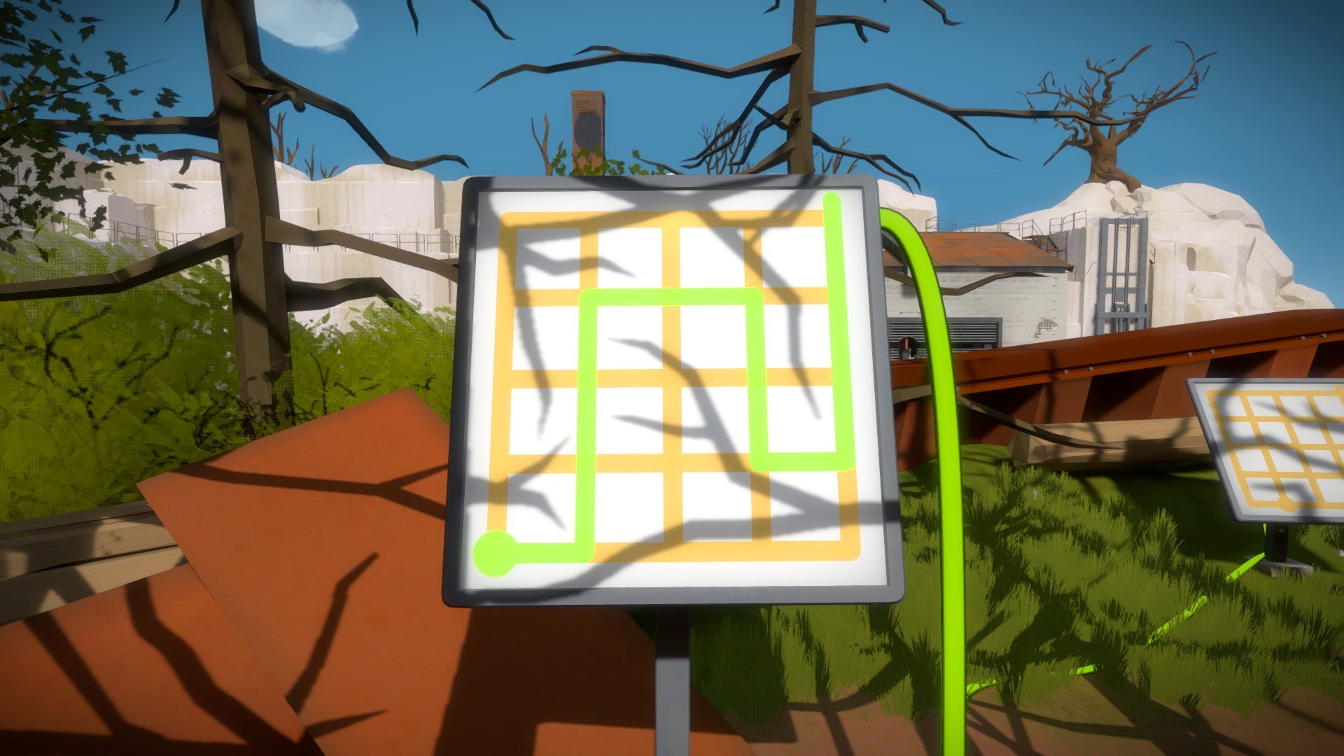De volgende puzzels vind je dieper in het bos. Volg de geactiveerde kabel. Je komt bij een puzzel die half is afgedekt. Als je goed naar de roestige plaat kijkt, zie je een duidelijk lichttunnel die je op het scherm moet volgen. In feite gaat het dus om exact hetzelfde principe als daarnet, alleen valt de schaduw niet meer rechtstreeks netjes op het scherm maar moet je deze van de omgeving afleiden. Hetzelfde principe geldt ook voor de twee volgende puzzels. Hou voldoende afstand van de scherm en probeer deze vanop een afstand te bedienen om het overzicht te bewaren.