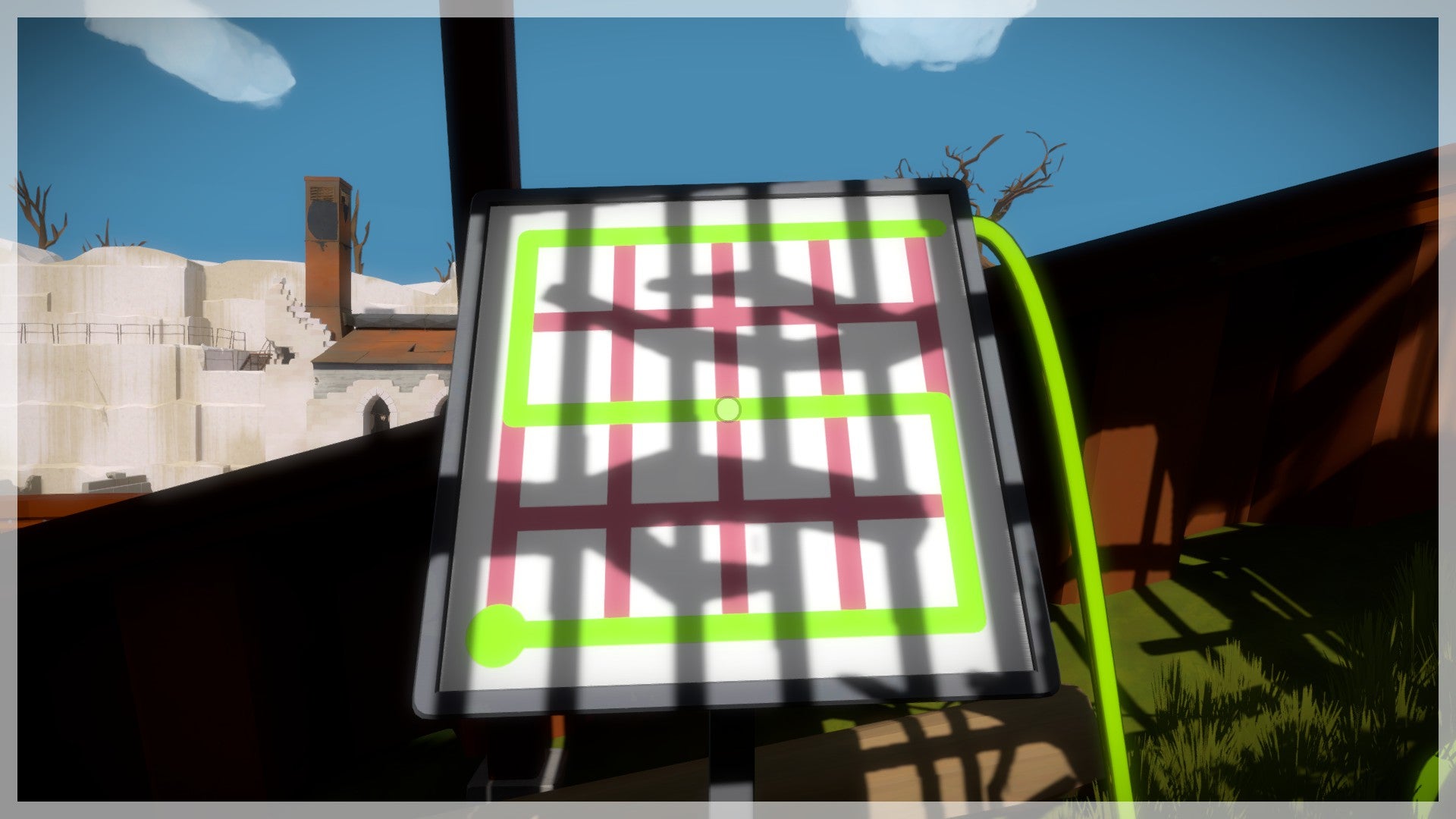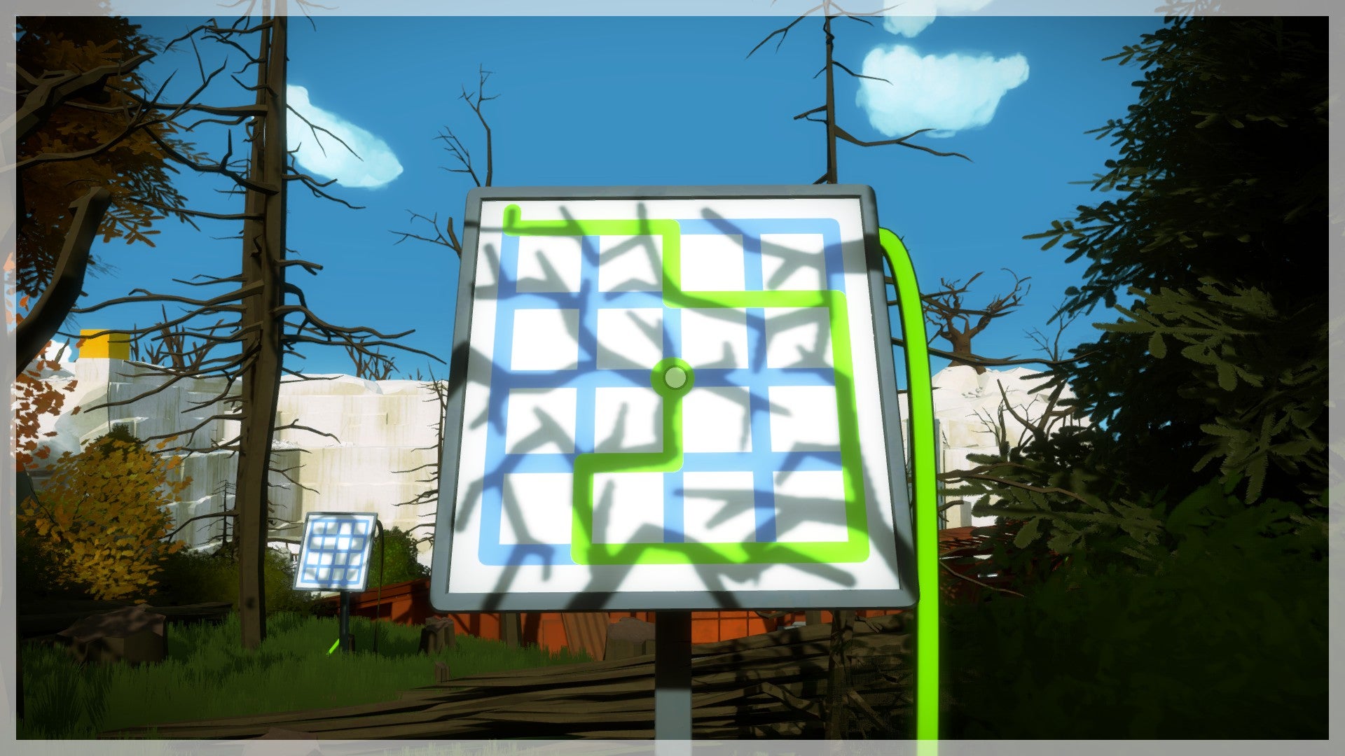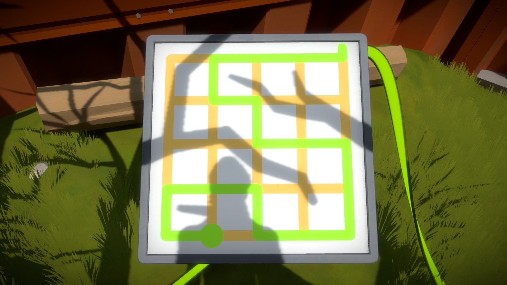 Neem de trap naar beneden en ga naar het eerste scherm dat aanstaat. Net als bij alle andere puzzels moet je de lijn van het begin- naar het eindpunt leiden. Let echter op de schaduwen van de bomen die op het patroon vallen. Om de juiste oplossing te vinden moet je de lijn langs de schaduwen van de takken leiden. Herhaal dit proces ook bij de volgende puzzel. Voorlopig is dit nog erg gemakkelijk als je het eenmaal ziet!