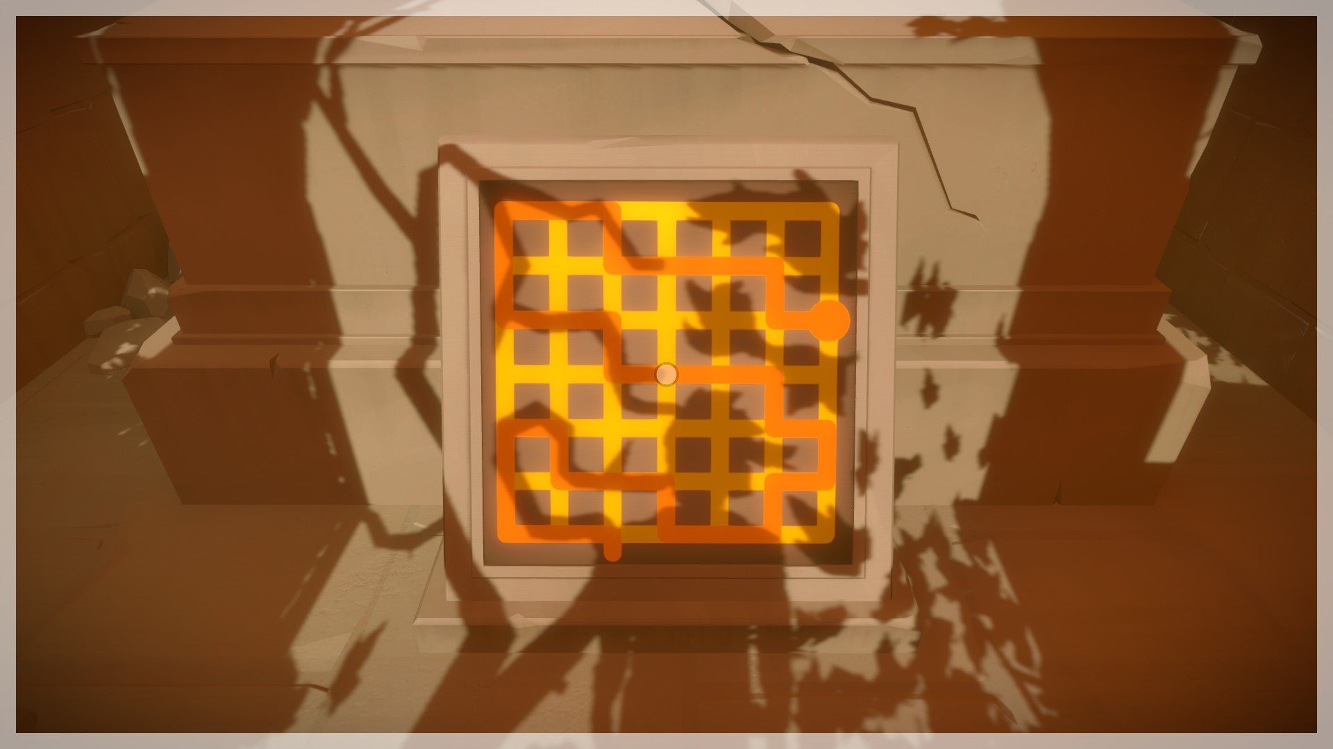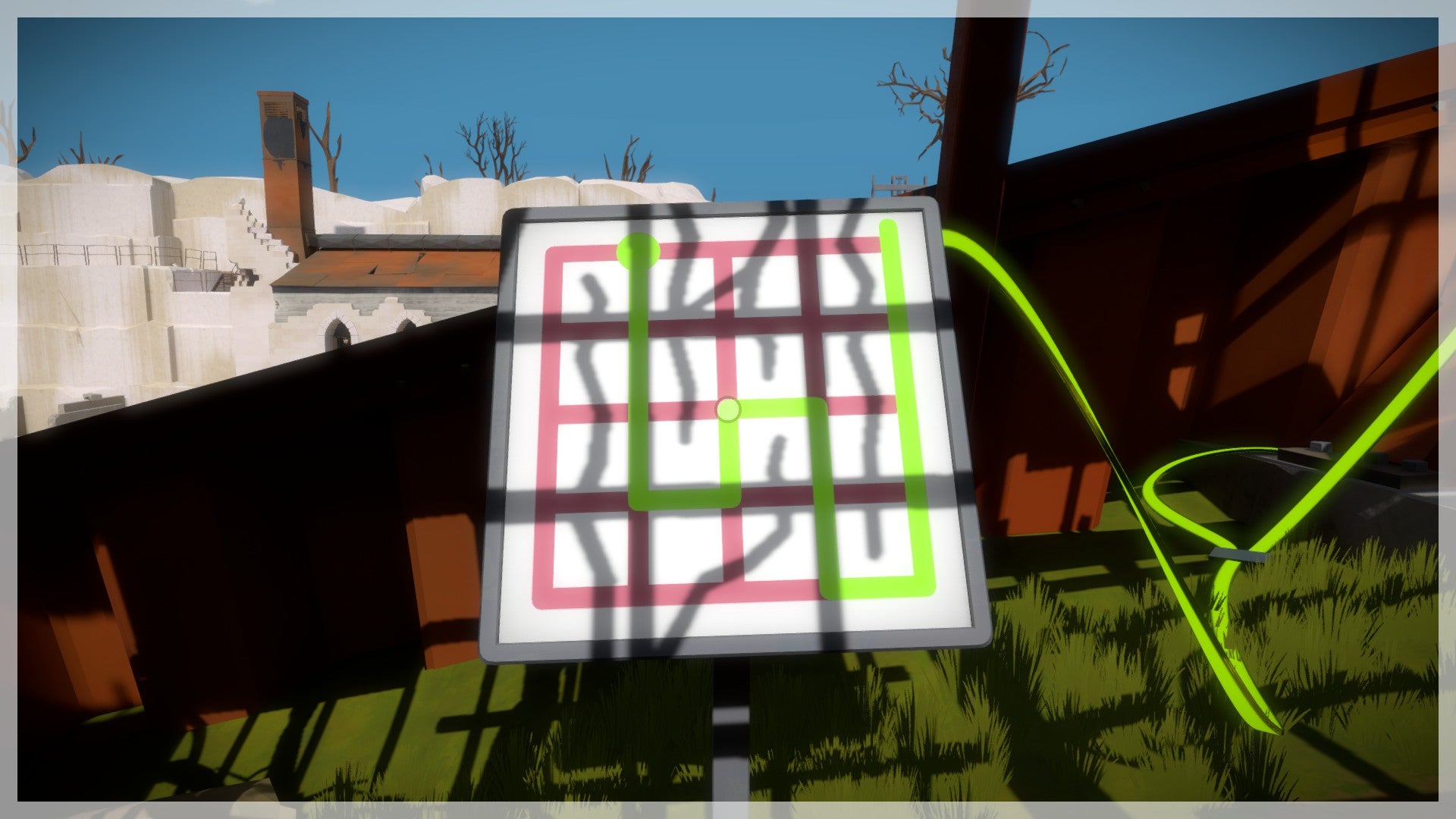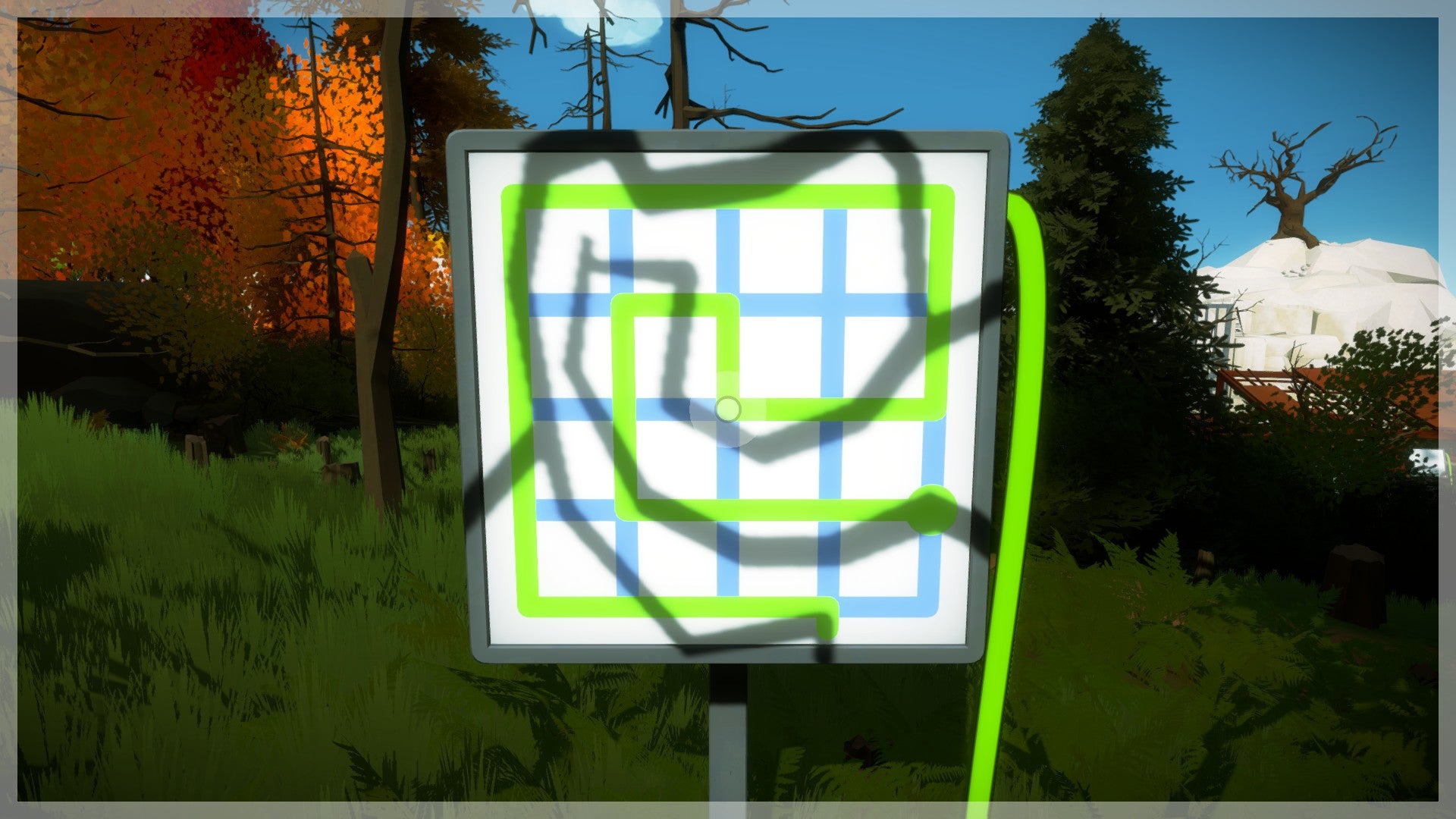 Neem de trap naar beneden en ga naar het eerste scherm dat aanstaat. Net als bij alle andere puzzels moet je de lijn van het begin- naar het eindpunt leiden. Let echter op de schaduwen van de bomen die op het patroon vallen. Om de juiste oplossing te vinden moet je de lijn langs de schaduwen van de takken leiden. Herhaal dit proces ook bij de volgende puzzel. Voorlopig is dit nog erg gemakkelijk als je het eenmaal ziet!