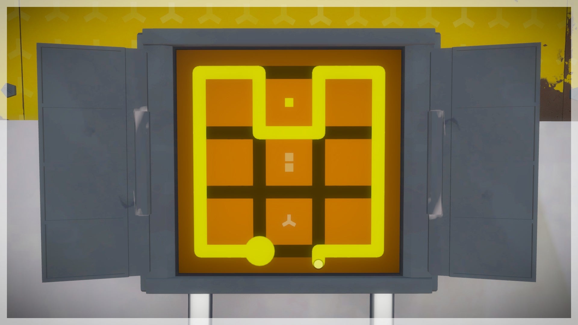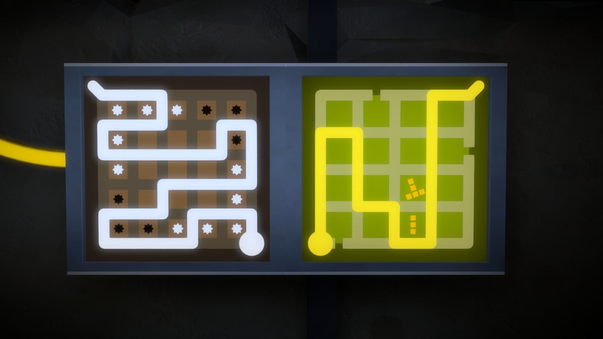 Ga vanaf de Steengroeve naar het gebouw aan het water aan de overkant van het riviertje. Neem de trap naar beneden. Om deze twee puzzels op te lossen moet je weten hoe sterren en tetrisblokken werken. Dat sterren altijd in duo's van dezelfde kleur in hetzelfde gebied moeten afgebakend worden, leer je in sectie 11. Boomhutten. Dat tetrisblokken geometrische figuren zijn die precies met de afbakening overeen moeten stemmen, dat je schuine figuren mag draaien en dat je verschillende vlakken mag combineren in hetzelfde afgebakende gebied, leer je in sectie 10. Moeras. Het is dus aan te raden eerst deze twee secties te bezoeken. Anders ga je veel moeite hebben met het begrijpen van deze puzzels.