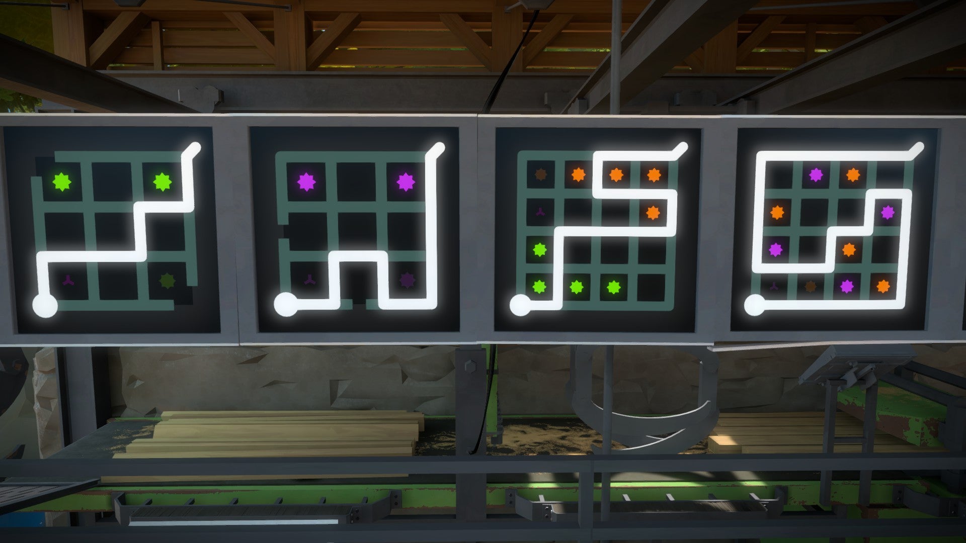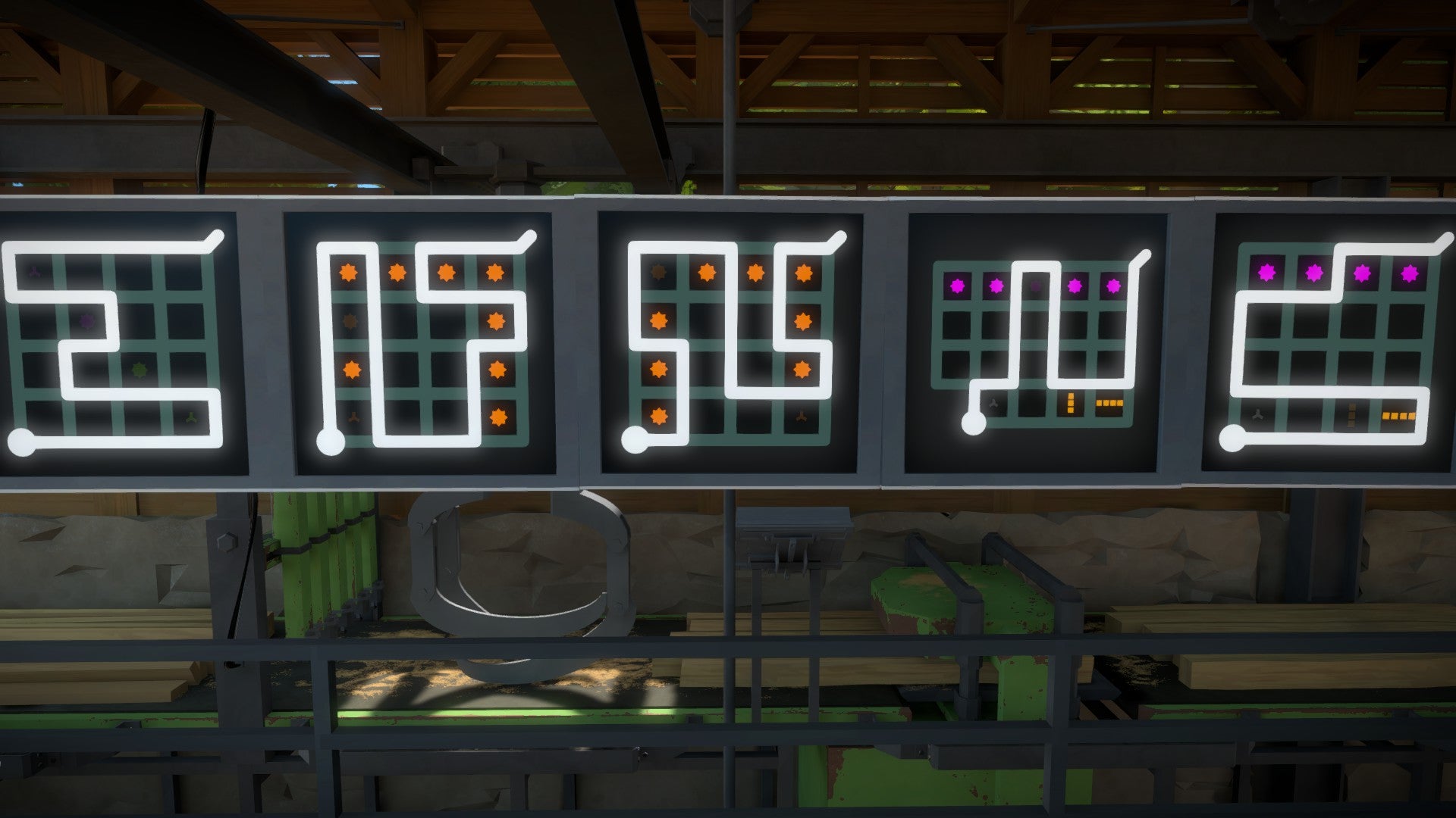 De houtzagerij vormt een duo met de steengroeve. Je moet alle puzzels op beide plaatsen oplossen voordat de laser tevoorschijn komt. Gelukkig is de steengroeve vlakbij en hebben ze hetzelfde type puzzel als thema: het eliminatiesymbool. Wie het gemist heeft, het eliminatiesymbool dwingt je om een opzettelijke fout te maken. Dat vereist een stevige hersenkronkel dus voor wie het geduld mist hebben we hieronder alle oplossingen verzameld voor de houtzagerij!