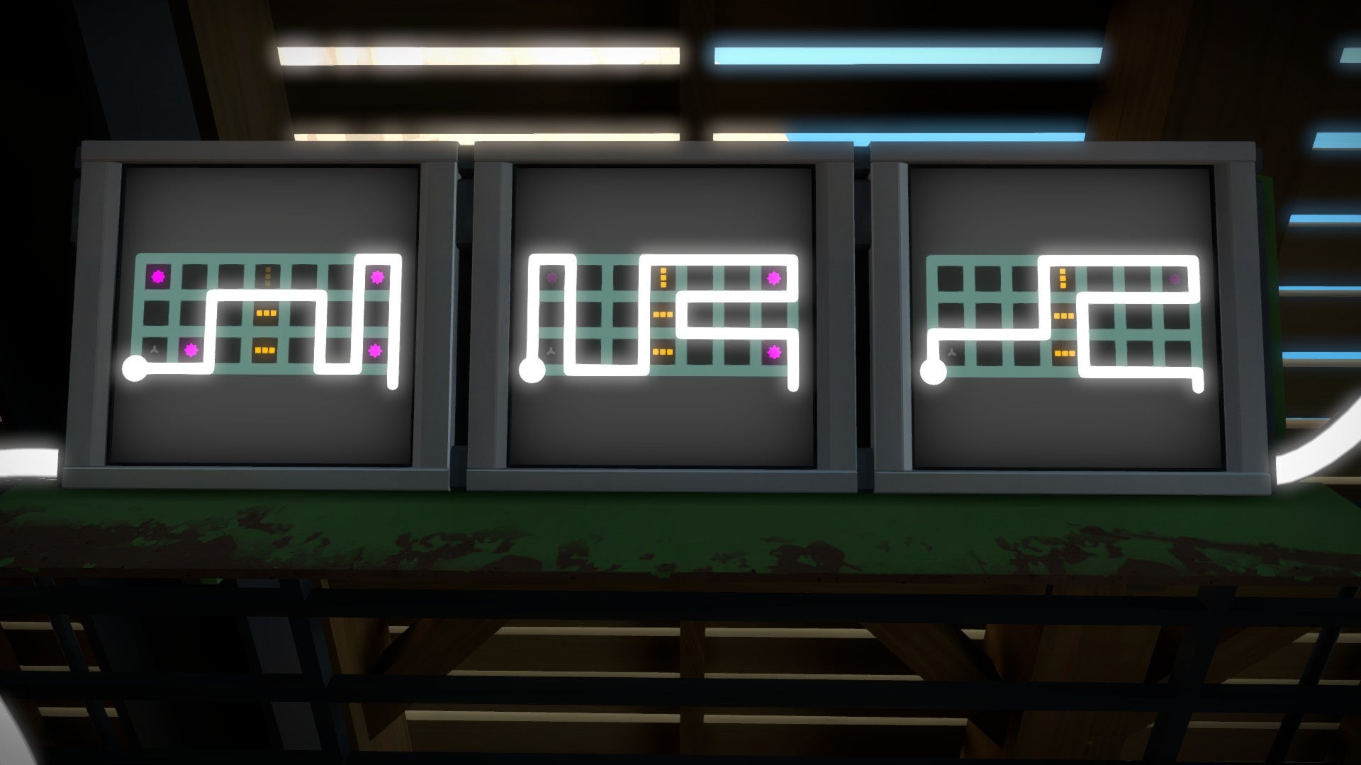 Als je alle vijf puzzels hebt opgelost, ga je verder over de wandelweg naar het volgende scherm. Deze puzzel bestuurt de ramp die je eerder maakte. Maak een patroon waarbij de meest rechtse blokken door de eliminatie wegvallen. Spring op de ramp wanneer deze voorbij komt (misschien wel het meest actievolle moment in de hele game!) en volg het pad naar de overkant waar er meer puzzels op je wachten.
