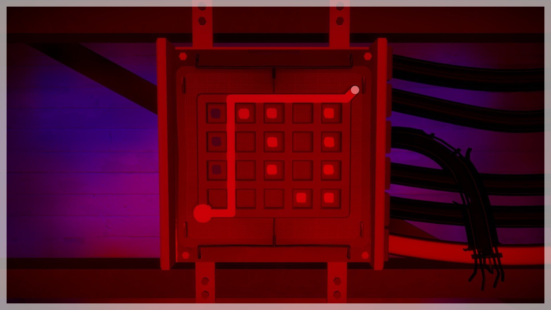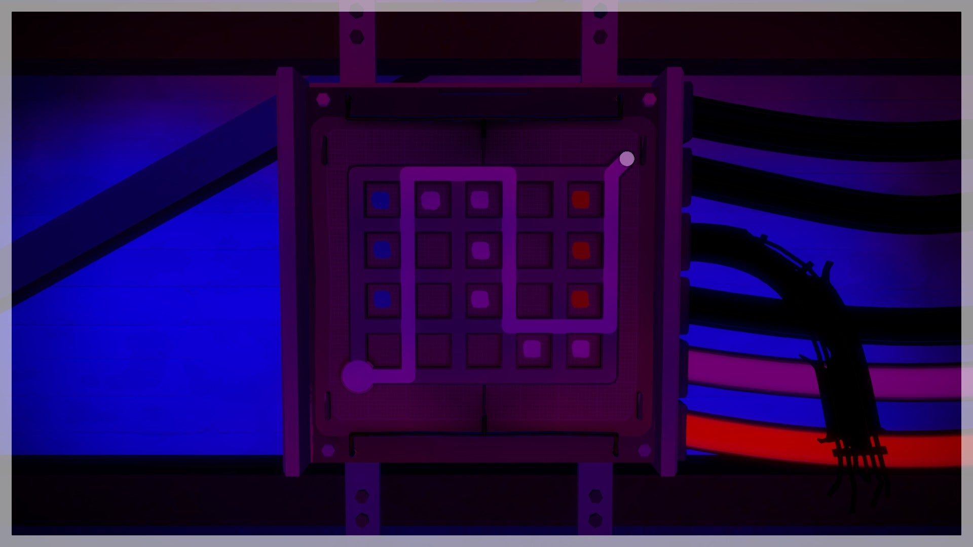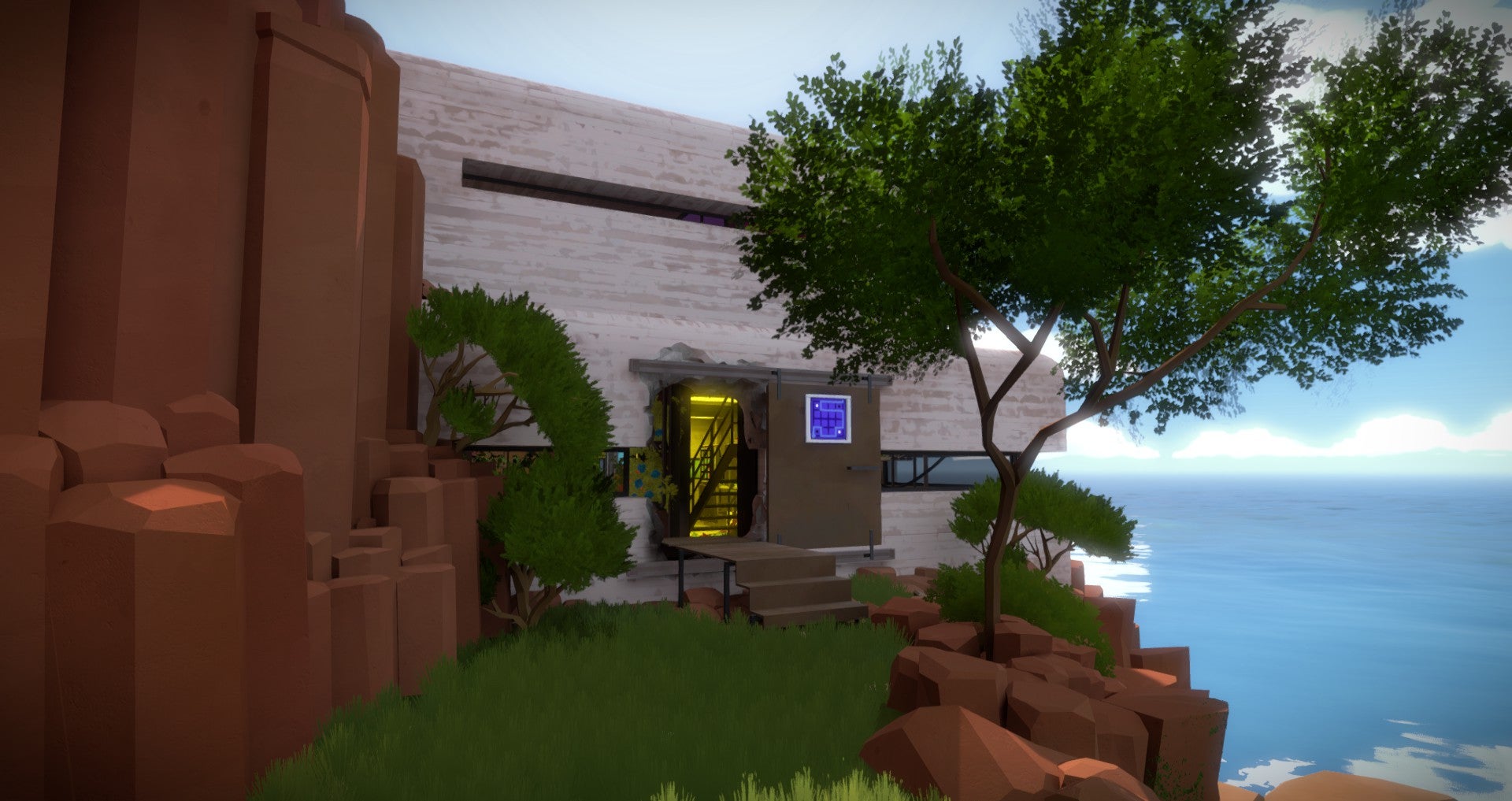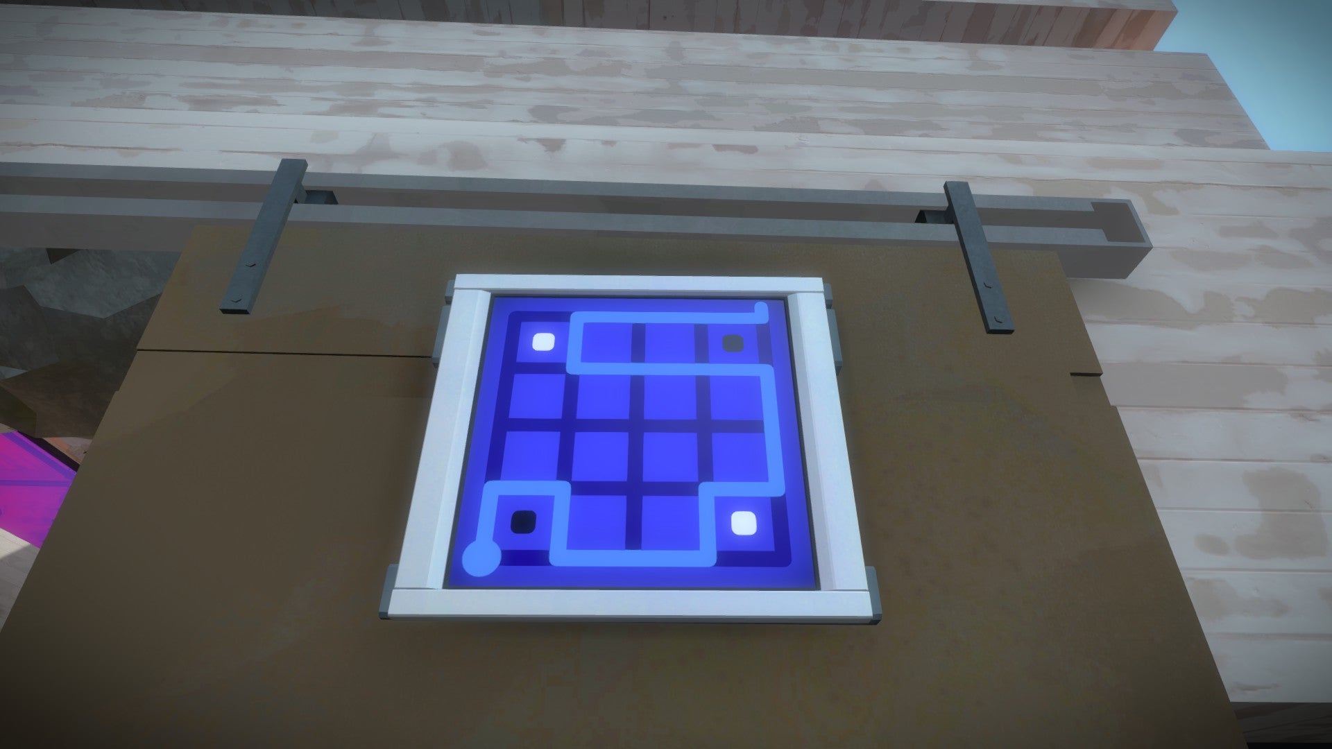 Je vindt de ingang van de bunker aan de voet van de berg bij de zee. Los de puzzel op de deur op door de witte van de zwarte vlakken te scheiden. Het scheiden van vlakken met verschillende kleuren is het centrale thema van de sectie. Maar maak je alvast klaar voor enkele onvoorspelbare twists.