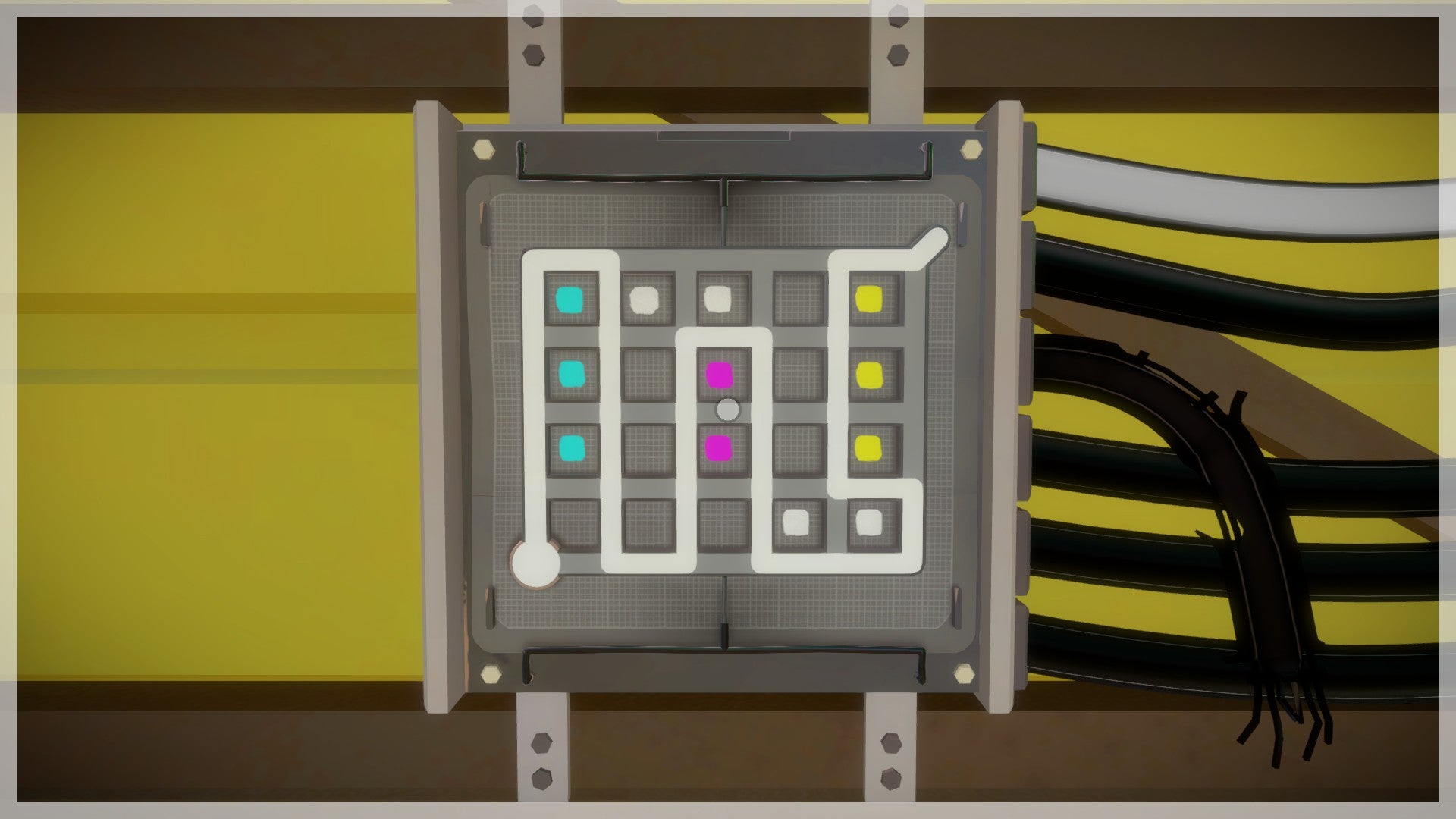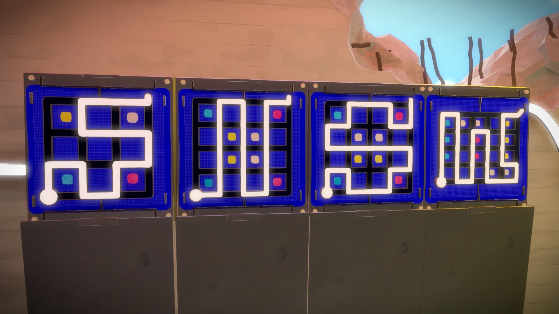Binnen in de bunker zie je links 5 schermen. Los deze puzzels op door de vlakken van verschillende kleuren van elkaar te scheiden.
