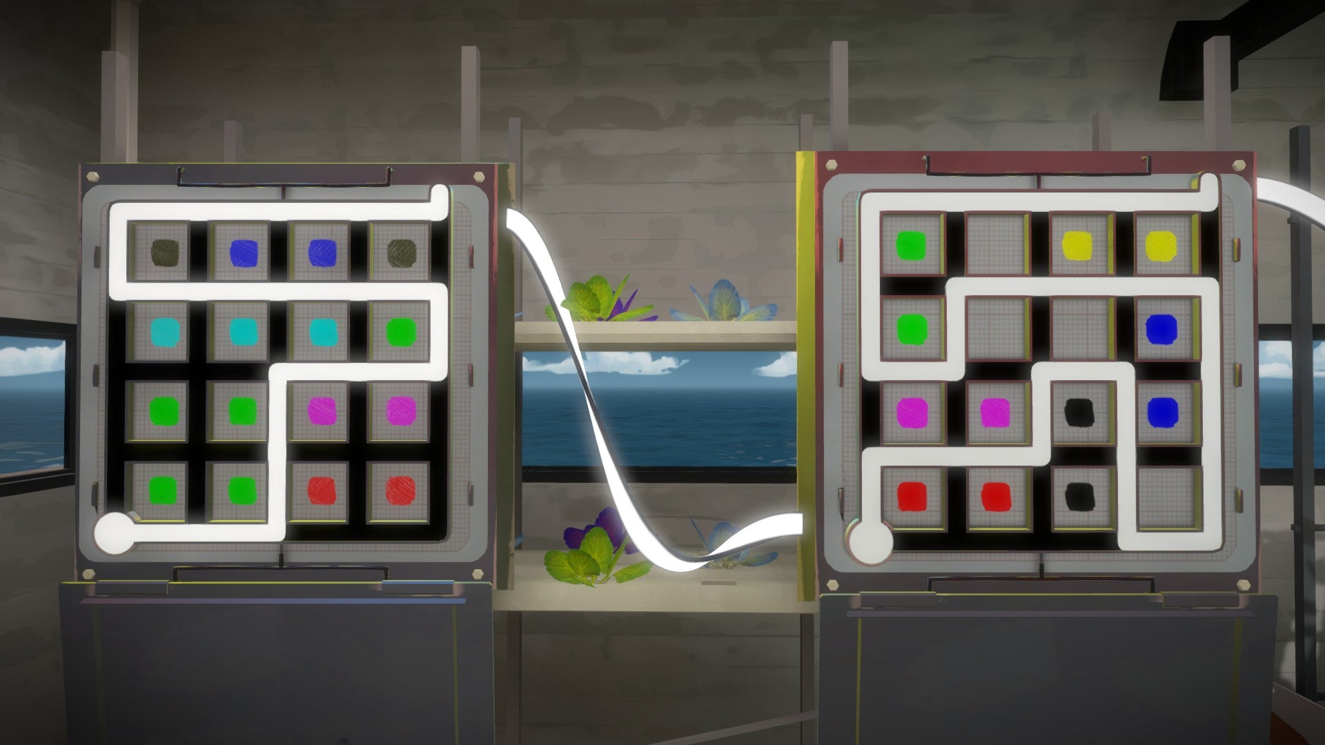 Achter het glas zie je links een puzzel. Deze bevat echter te veel kleuren om te kunnen oplossen. Neem een paar stappen achteruit en bekijk te puzzel van achter het gele glas. Je ziet nu duidelijk welke kleuren van elkaar moeten gescheiden worden. Kijk voor de twee puzzel door het glas van de blauwe deur en combineer voor de derde puzzel zowel het gele als het blauwe glas om een patroon te ontdekken.