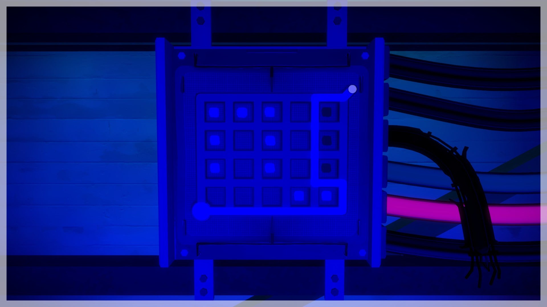 Wanneer deze opgelost zijn activeren er 4 nieuwe puzzels aan je rechterkant. Los deze op om de deur met blauw glas te openen.