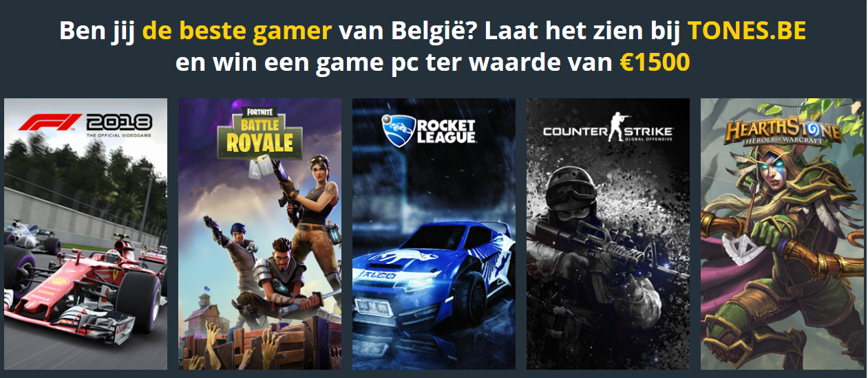 De nieuwste esport-competitie van Tones biedt voor iedereen wat wils: gamers trotseren elkaar in F1 2018, Fortnite, Rocket League, Counter-Strike: Global Offensive en Hearthstone. Je strijdt niet alleen om de bragging rights, maar ook om de hoofdprijs: een gloednieuwe gaming pc t.w.v. 1500 euro!