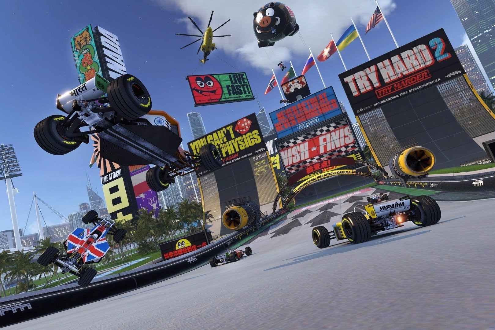 Honderdsten van een seconde. Onmogelijk om waar te nemen, maar toch alles waar Trackmania Turbo om draait. Of je nu al driftend een looping doorvliegt, op een exotisch strand tegen een opblaasbaar varken tot stilstand komt of door een helikopter vanop vijftig meter naar beneden wordt gegooid. Het is altijd een gevecht tegen de tijd. En tegen jezelf, want als je nog één keer probeert, zul je die toptijd heus wel verslaan. Vergeet even dat je jezelf dat tien pogingen eerder ook al wijsmaakte.
