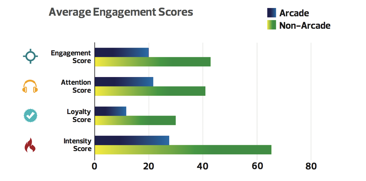 Het verschil in type games is direct duidelijk: spelers gebruiken Arcade games gemiddeld 1,4 sessies voor 23,9 minuten. Non-Arcade games worden gemiddeld 17,9 maal opgestart en 28,8 minuten gespeeld. Gamers raken ook significant meer betrokken bij de Non-Arcade variant. Op de drie vlakken van betrokkenheid scoren deze games hoger. Ten eerste blijven gebruikers langer op de site (aandacht), ten tweede komen spelers vaker terug (loyaliteit) en ten slotte verrichten gamers meer handeling per sessie (intensiteit).