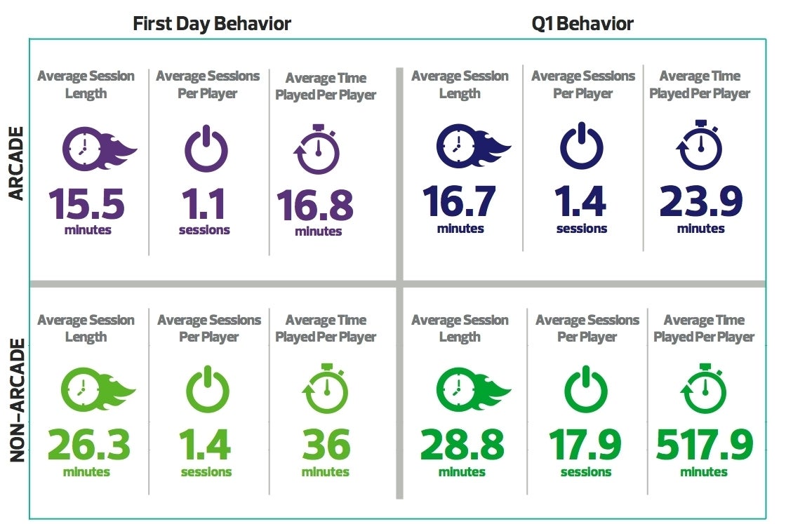 Playnomics maakt onderscheid tussen Arcade en Non-Arcade games. Arcade games zijn bedoeld om een korte periode te spelen en geven dircte voldoening. Sessies duren vaak minder dan een half uur en spelers komen niet vaak terug om het spel nog een keer te starten. Het zijn causal games pur sang. Non-Arcade games bieden gameplay voor langetermijn (denk aan meerdere levels, verzamelobjecten).