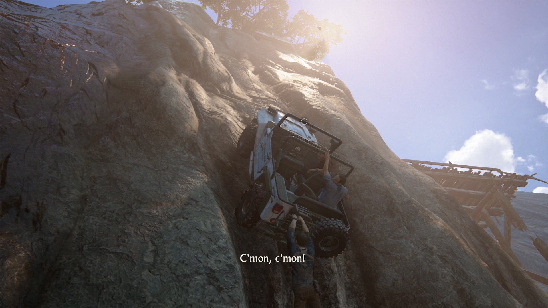 En dan blijkt de trekhaak opnieuw onze redding. Het touw hangt nog steeds stevig rond de boom en zorgt ervoor dat de auto abrupt stopt, middenin zijn val. Furieus laat Nathan de trekhaak ons naar boven hijsen. Maar ondertussen breken er stukken rots af. Eén van hen raakt de jeep met een enorme impact. De wagen valt verder naar beneden en opnieuw houdt de trekhaak iedereen in leven. Nathan wordt door de schok echter uit zijn stoel gekatapulteerd en hij grijpt zich met alle macht vast aan Sam en vervolgens aan de auto. Terwijl je traag maar zeker weer naar boven klautert is het moeilijk om niet te denken aan het befaamde begin van Uncharted 2.