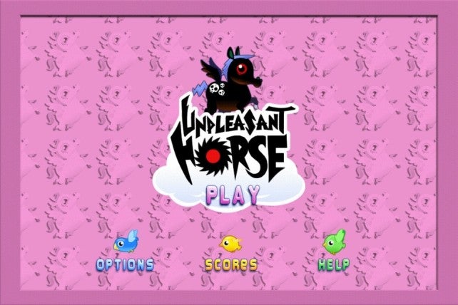 De titel draait om een minder sjofel zwart paard. Met dit paard is het zaak om van wolk naar wolk te hupsen om ondertussen mooiere paarden mee te sleuren in gehaktmolens en kleine vogels de veren af te nemen. Unpleasant Horse kwam eerder niet door de keuring van Apple. De game is echter aangepast en vanaf nu te downloaden.