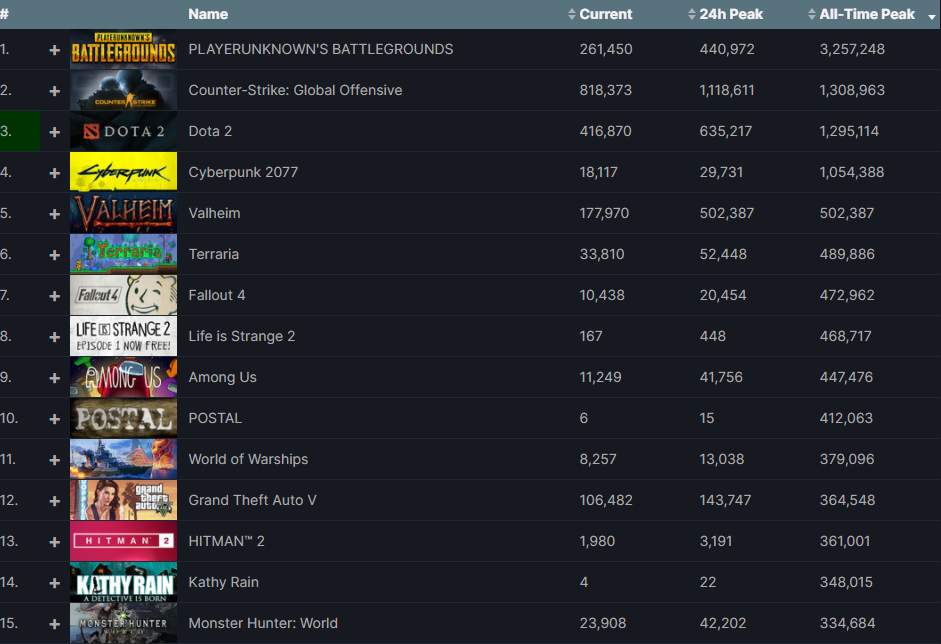 Op het moment van schrijven wordt de game vaker gespeeld dan Team Fortress 2, Apex Legends, GTA 5 en Rust. Laatstgenoemde beleeft momenteel ook een opleving, want die bereikte afgelopen januari een piek van 244,394 gelijktijdige spelers op Steam. Multiplayergames lijken op Steam dan nog altijd in trek te zijn, met name co-op survival games.
