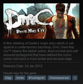 Ondertussen zijn verschillende games al van tags voorzien waar de ontwikkelaars en uitgevers zelf wellicht niet blij mee zijn. Zo is DmC: Devil May Cry de tags 'edgy '#TooEdgy4U' en 'f*** you.' Zoek je op 'casual,' dan vind je Dark Souls. Gone Home wordt ondertussen omschreven als 'not a game' en 'walking simulator.'