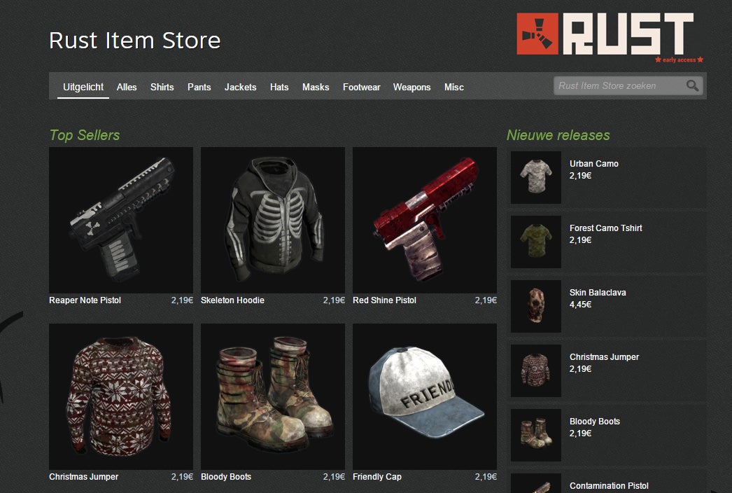De eerste game die zo'n Item Store heeft is de survivalgame Rust. Er zijn extra wapens te koop zoals de Reaper Note Pistol en de Red Shine Pistol, als ook cosmetische items in de vorm van broeken, shirt, bandana's en maskers.