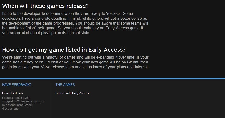 "De ontwikkelaar beslist zelf wanneer hij zich klaar voelt om een game uit te brengen," zo schrijft Valve. "Sommigen hebben een concrete datum voor ogen, terwijl anderen een conclusie bereiken naarmate de game wordt ontwikkeld."