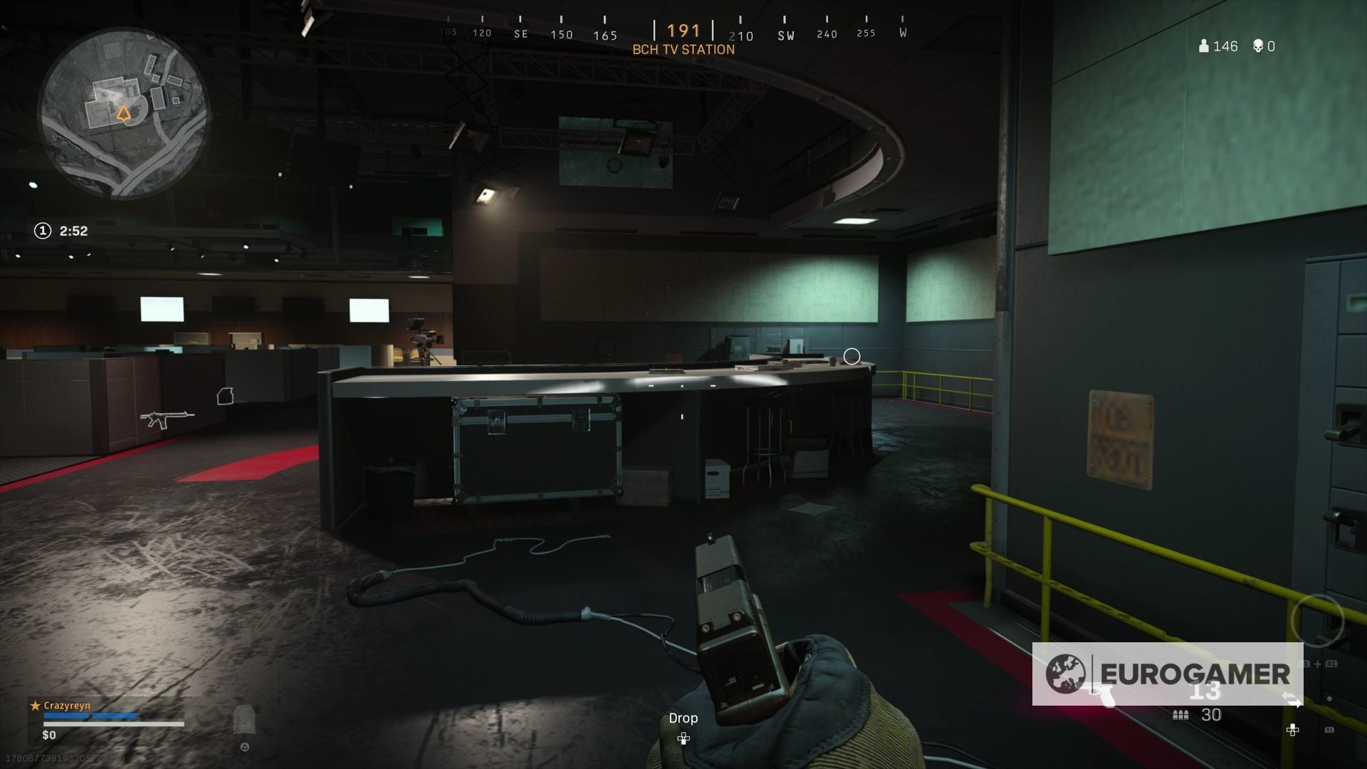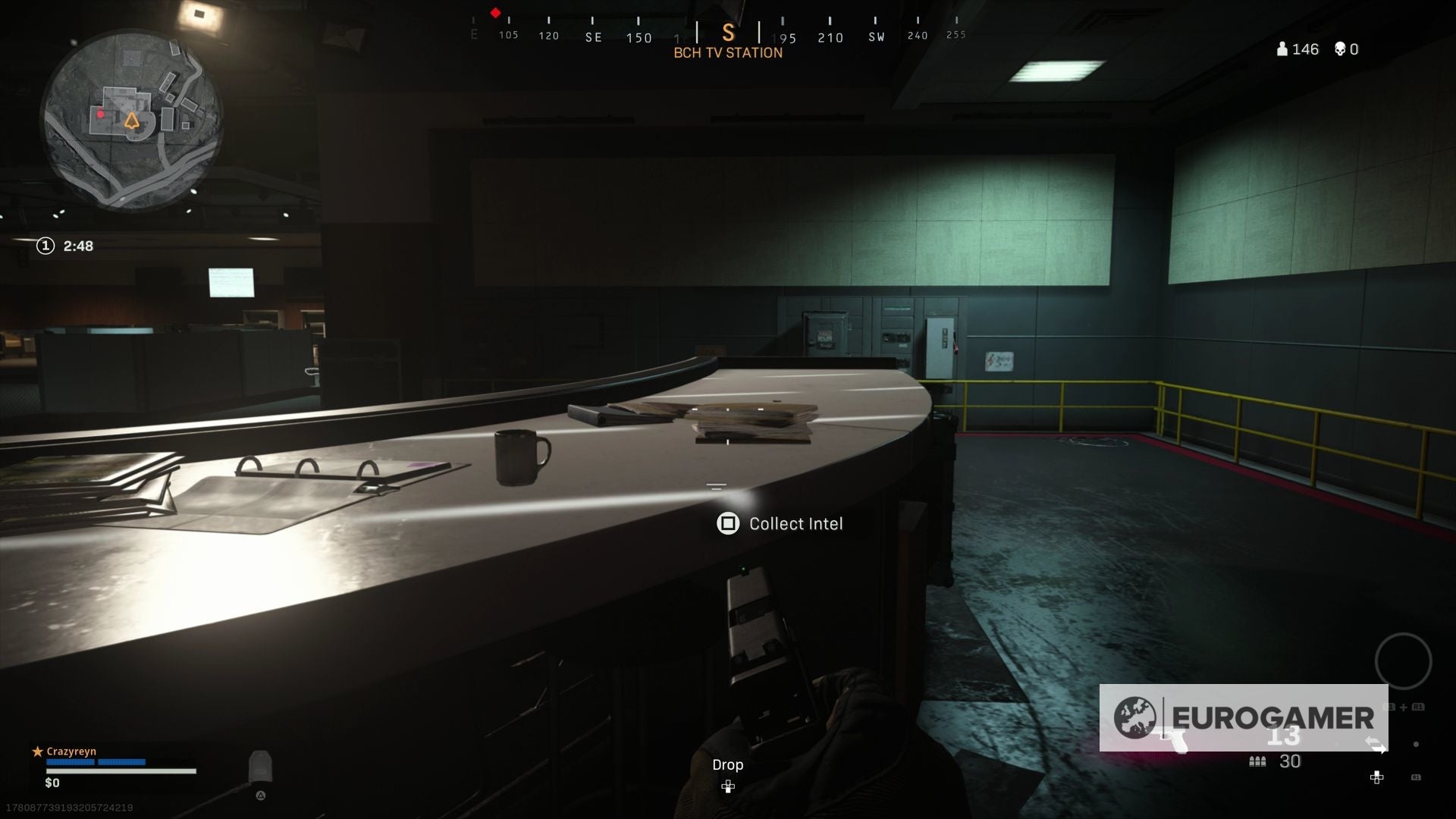 Als je moeite hebt om deze Fractured Intel snel te bereiken omdat het TV Station een populaire locatie is, probeer dan de match te starten door met je parachute door het gat in het dak van het tv station te landen op het gelijksvloers. Ga vervolgens door de dubbele door en ga naar rechts. Het bureau met de Fractured Intel is dan vlak voor je.