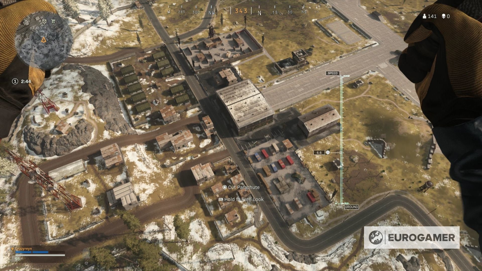 De Military Base is een locatie die uit verschillende gebouwen bestaat, maar je wil de grootste vinden die net niet in het midden staat.