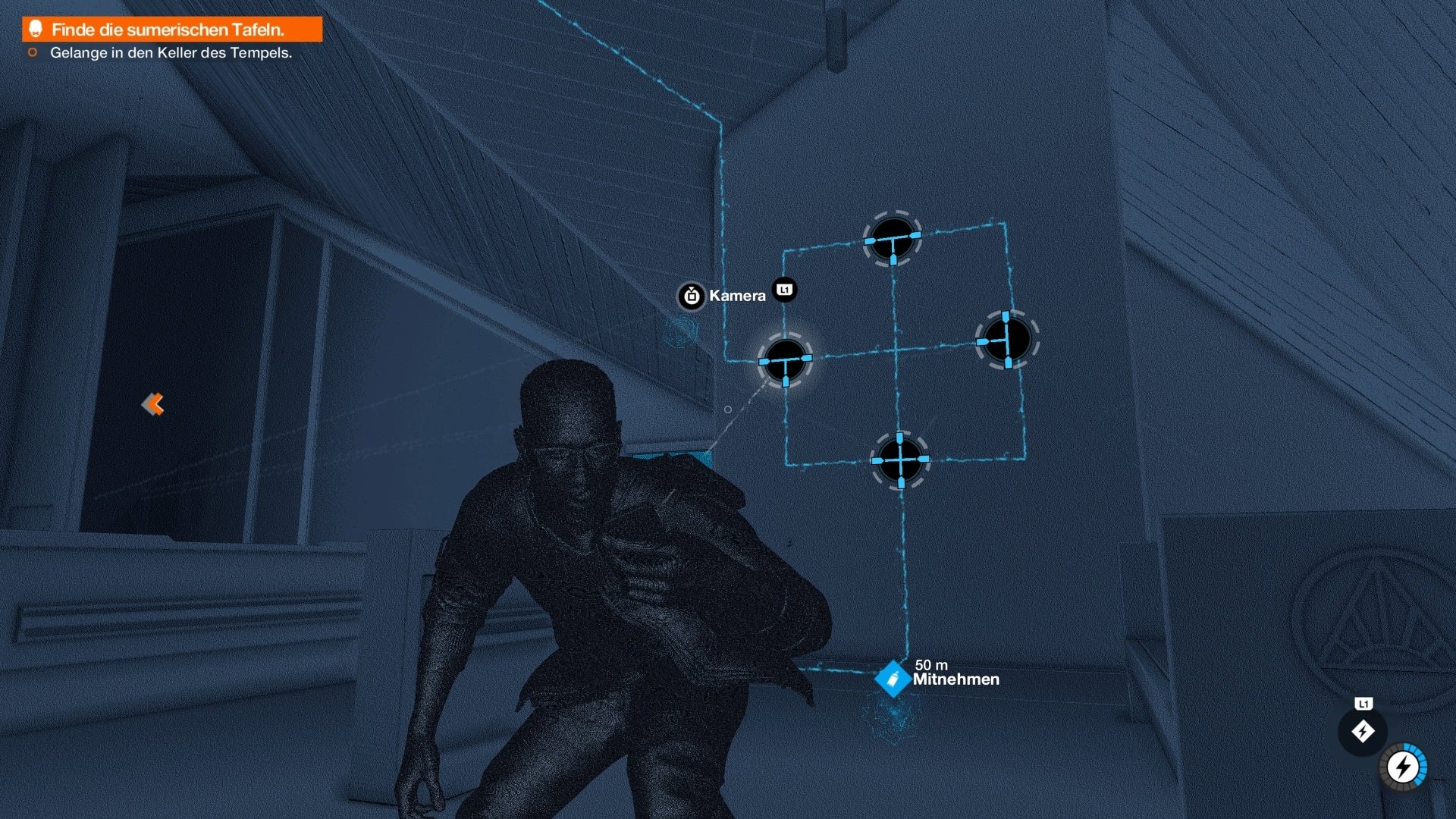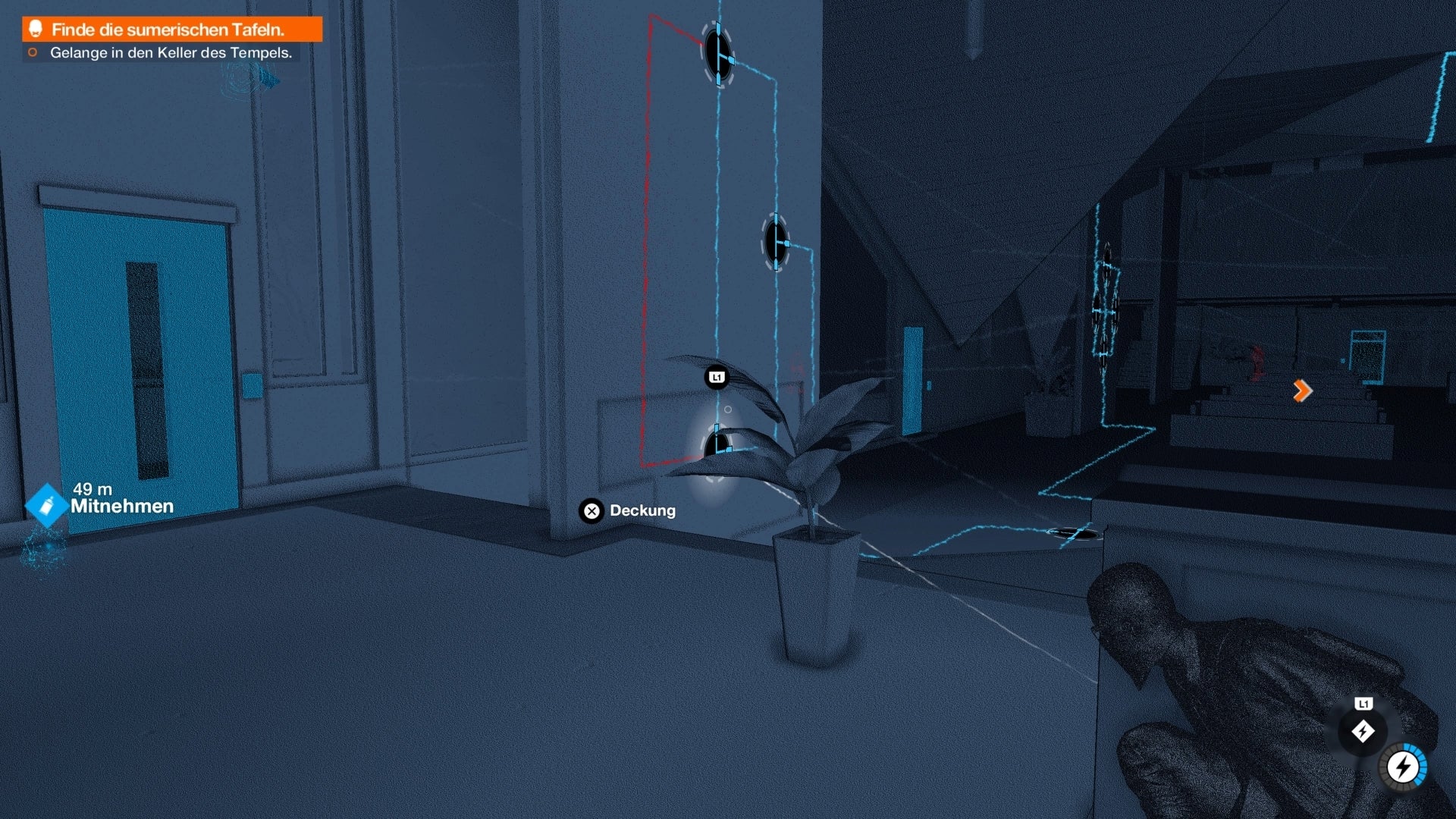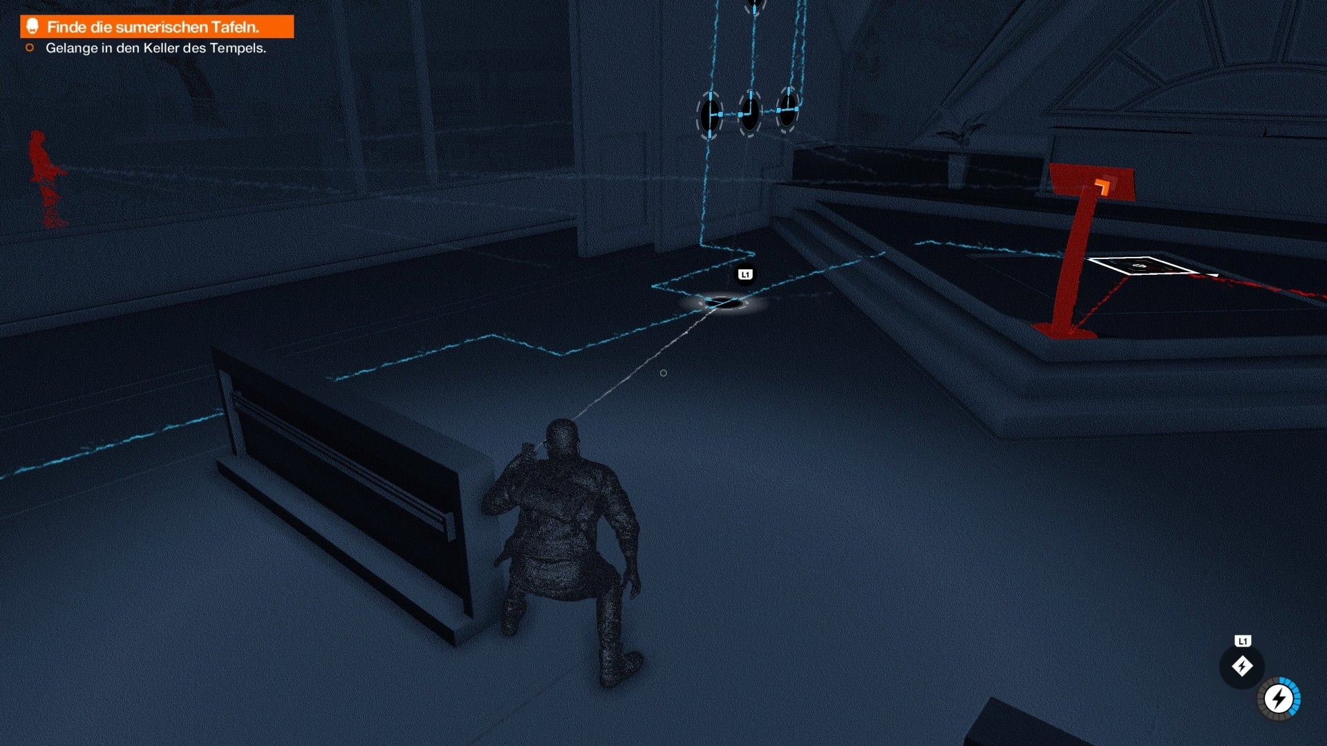 In het algemeen moet je er voor zorgen dat blauwe lijnen bij het altaar rood worden. Aan het einde open je de sloten in de grond om de data naar de console te leiden. Ga tenslotte voor de console staan en hack deze. Neem de geheime lift naar de kelder en neem de Soemerische tabletten en enkele audiobestanden.