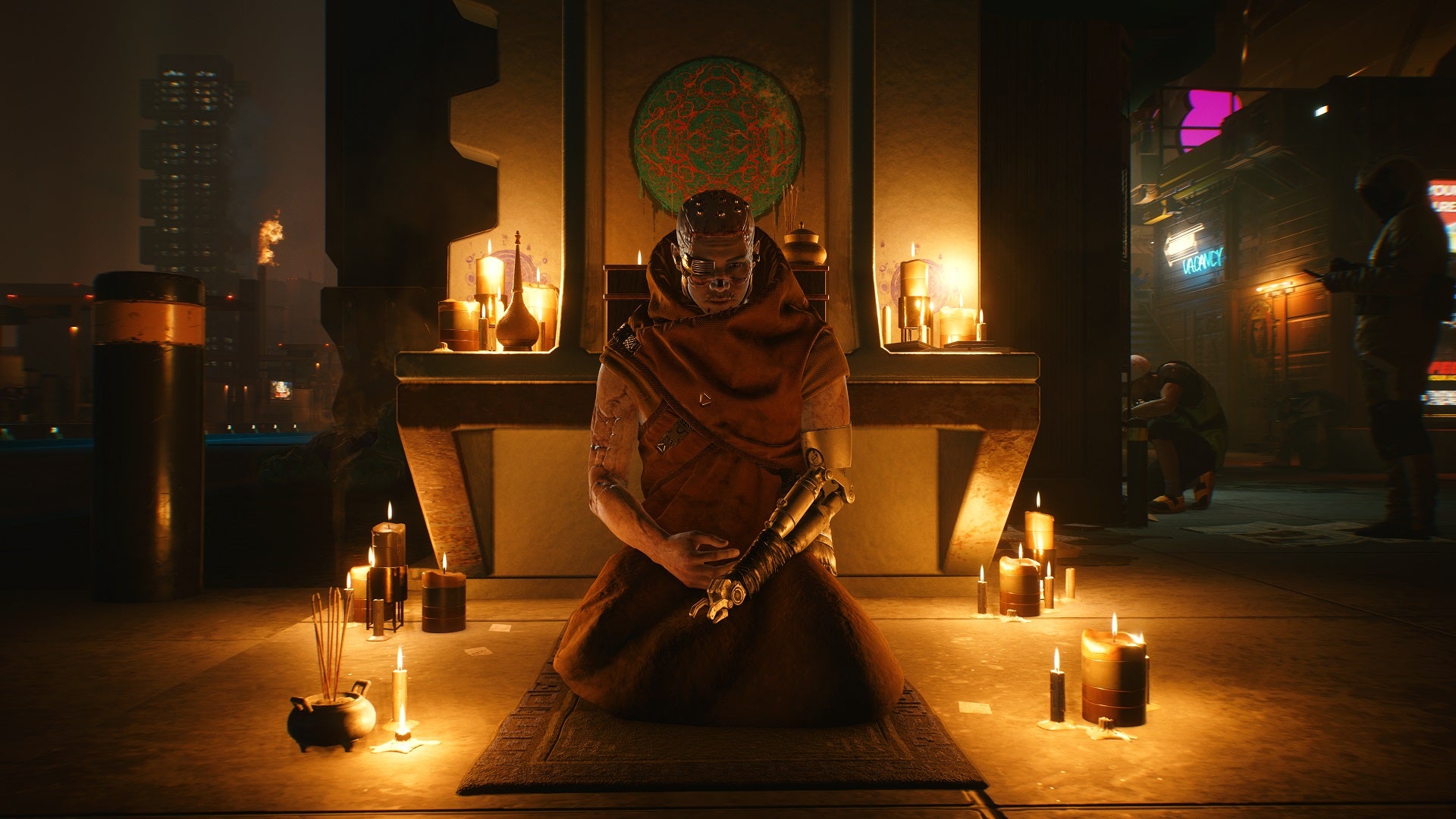 Hoe Cyberpunk zoveel personages precies op het scherm tovert, is me een raadsel. Ze bevolken de straten en stegen, maar ook de clubs en gebouwen binnenin. Zelfs bij m'n appartement staan er mensen op automaten te kloppen en dingen te roepen. Om m'n bestemming te bereiken loop ik voorbij talloze personages. Een kind roept mij toe dat ik een stomme kop heb en begint te lachen. De stoute persoonlijkheid van The Witcher 3 is ook hier intact gebleven.