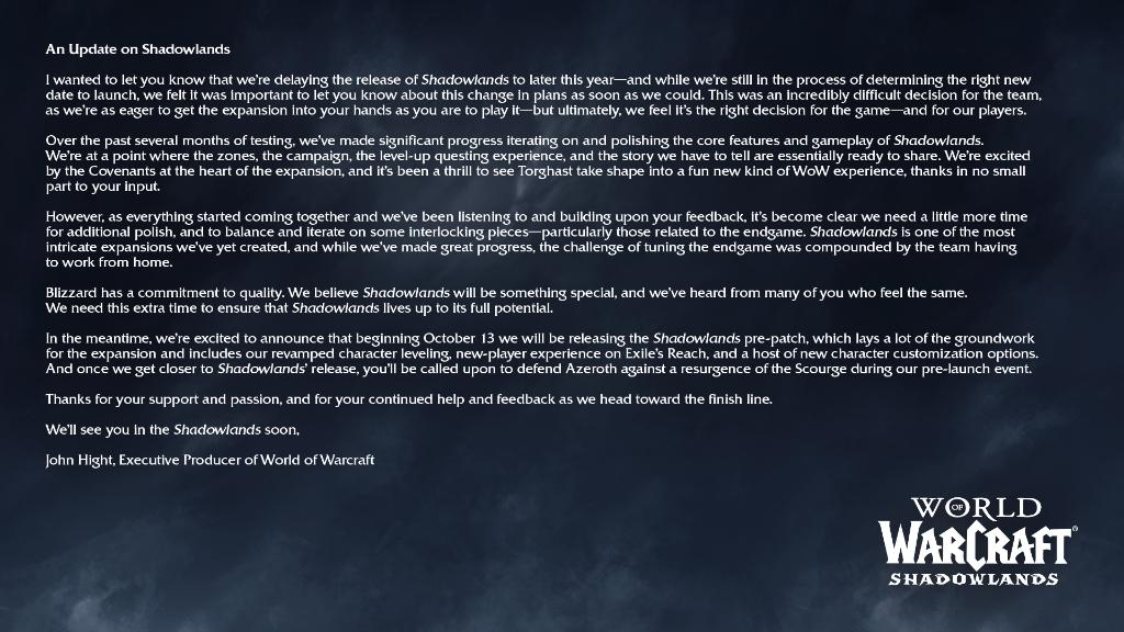 Blizzard heeft World of Warcraft: Shadowlands voor onbepaalde tijd uitgesteld. Dat maakte de ontwikkelaar via Twitter bekend. De achtste uitbreiding voor World of Warcraft zou oorspronkelijk op 27 oktober uitkomen.