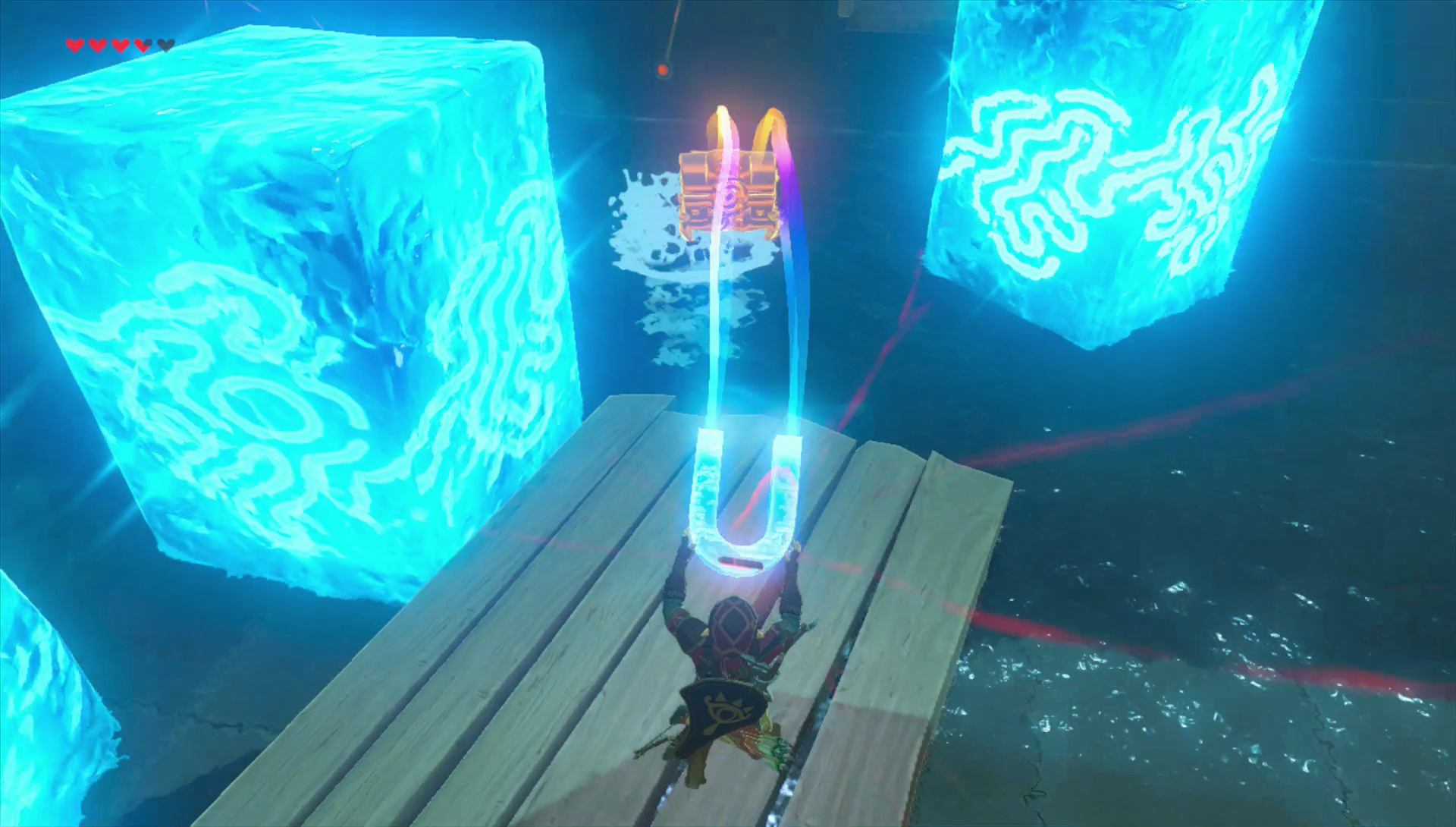 Bij het laatste stuk kun je de kist echter niet met Magnesis uit het water halen en moet je de kist met Cryonis en een ijspilaar uit het water tillen. Maak een brug van pilaren en open de schatkist om 5 Ijspijlen te vinden.