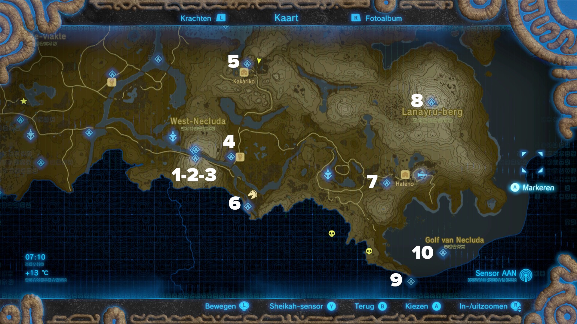 Alle tempels rond West-Necluda, Tweelingberg, Hateno, Lanayru-berg en Golf van Necluda.
