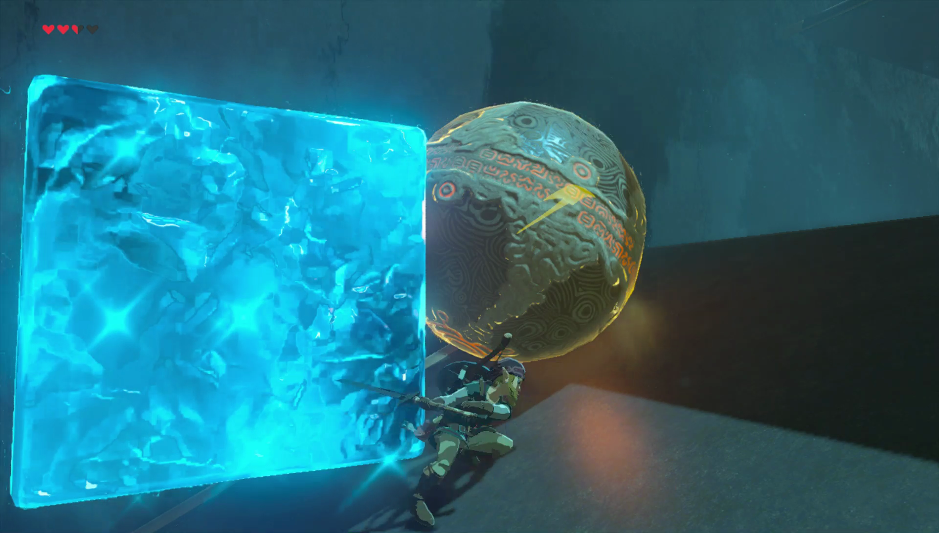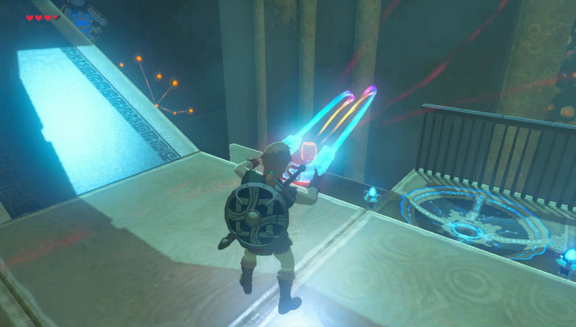 Je kunt nu meteen de Heldenbol grijpen, maar links zie je nog een schatkist. Om deze te bereiken moet je echter de ramp eerst naar boven brengen met de schakelaar. Zoek rechts beneden twee metalen tonnen. Grijp een met je Magnesis kracht en slinger die naar de overkant op de schakelaar. De ramp gaat naar boven en je kunt de kist openen om een Klimbandana te krijgen. Dit handige hoofddeksel vergroot je klimsnelheid.
