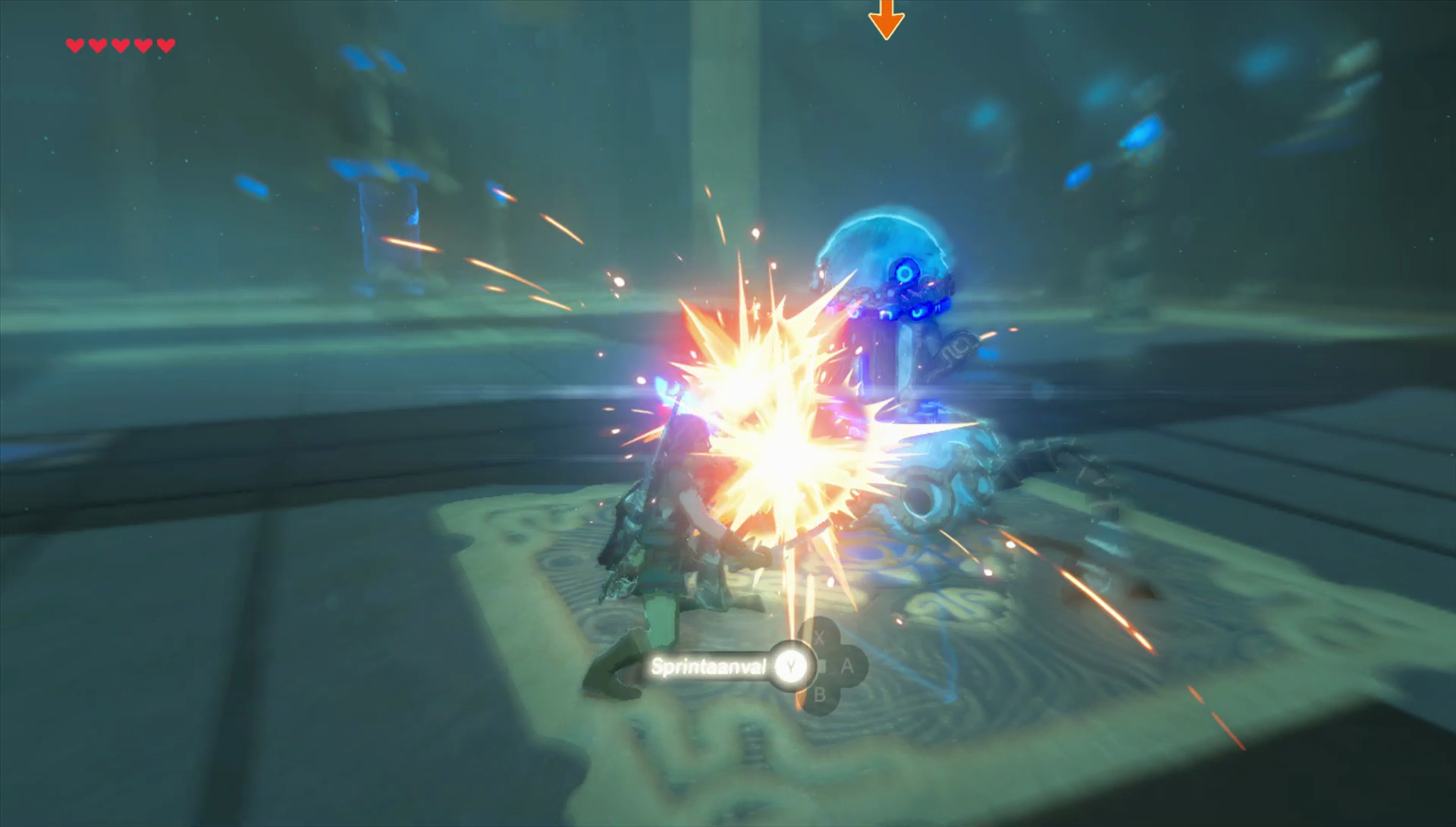 De uitdaging binnen de Tempel van Ta'loh Naeg is redelijk simpel. Het enige wat je moet doen is de Wachter verslaan. Open echter eerste de twee kisten links en rechts en raap de twee Sheikah wapens op: de Achtvoudige tanto en het Focus-schild. Loop wat verder om het gevecht te beginnen.
