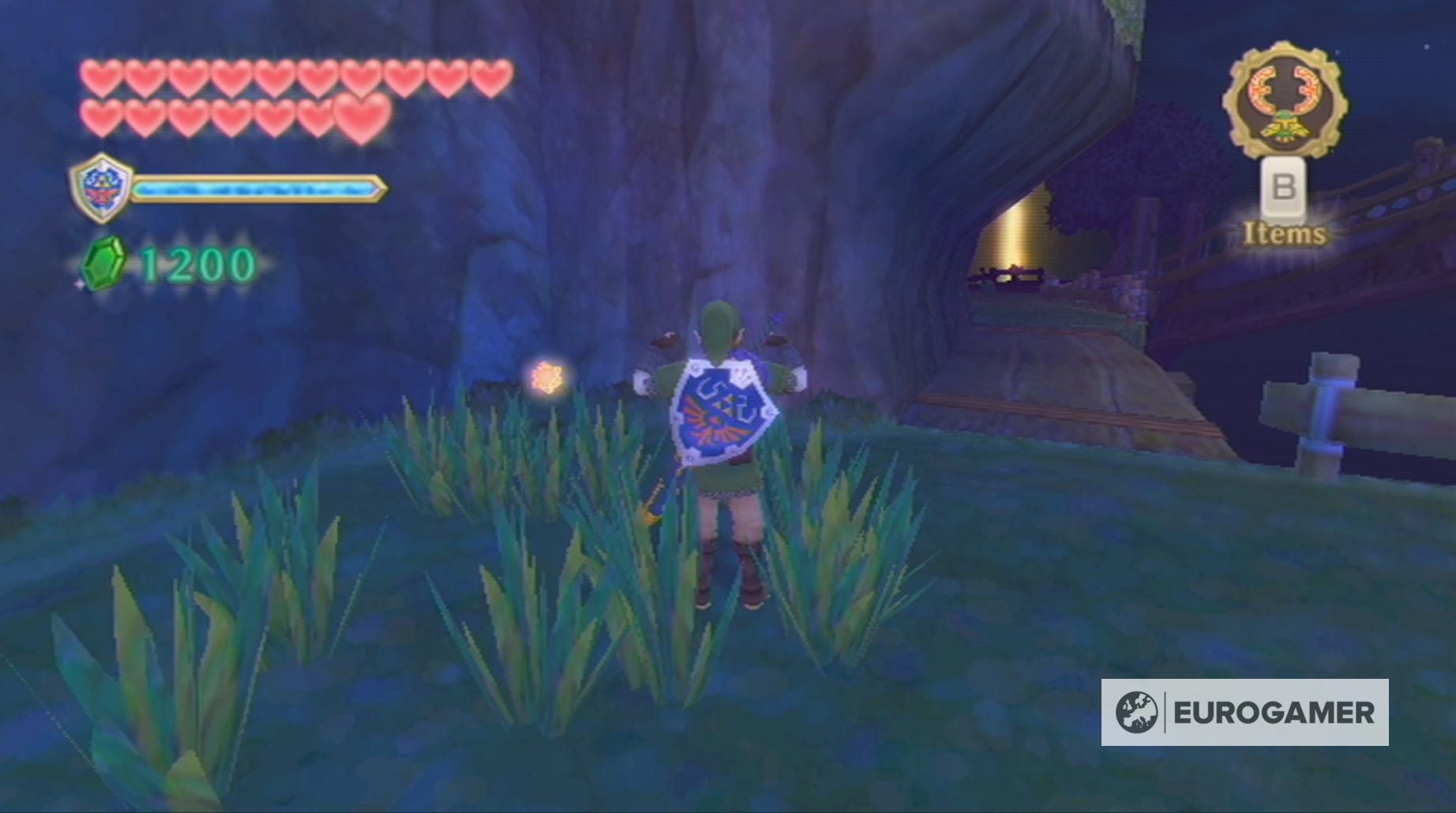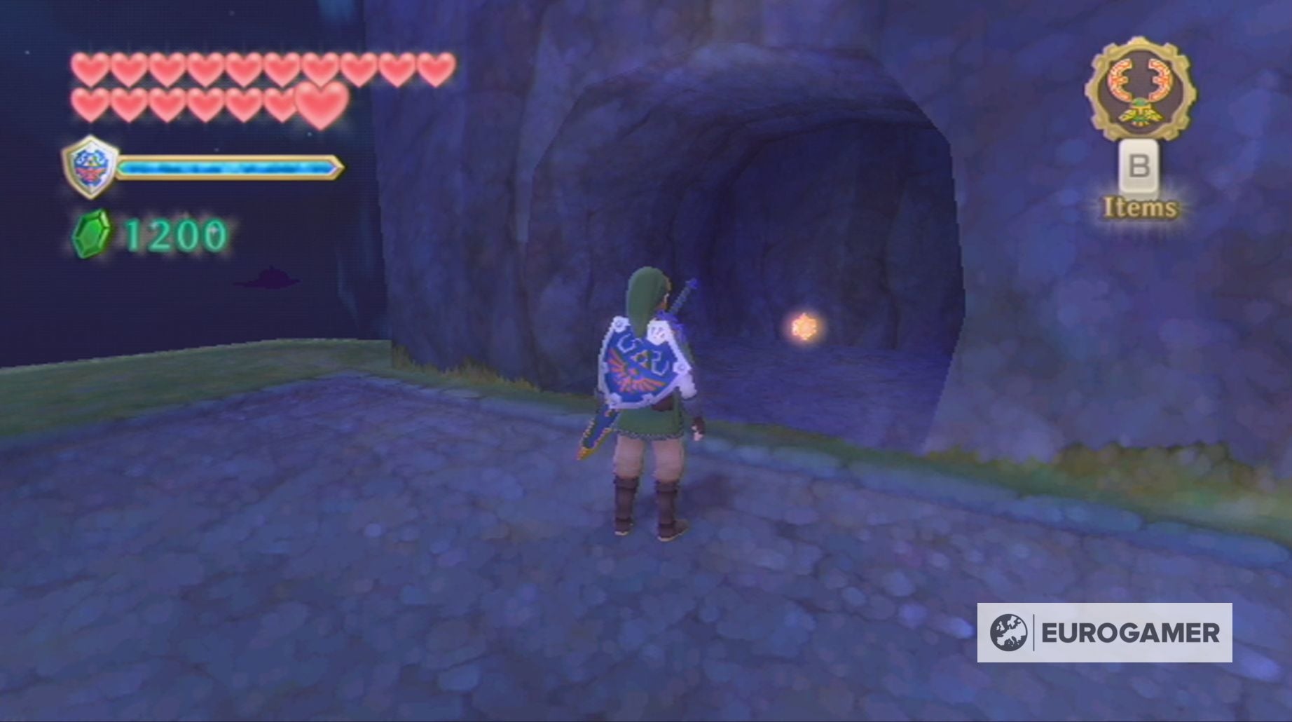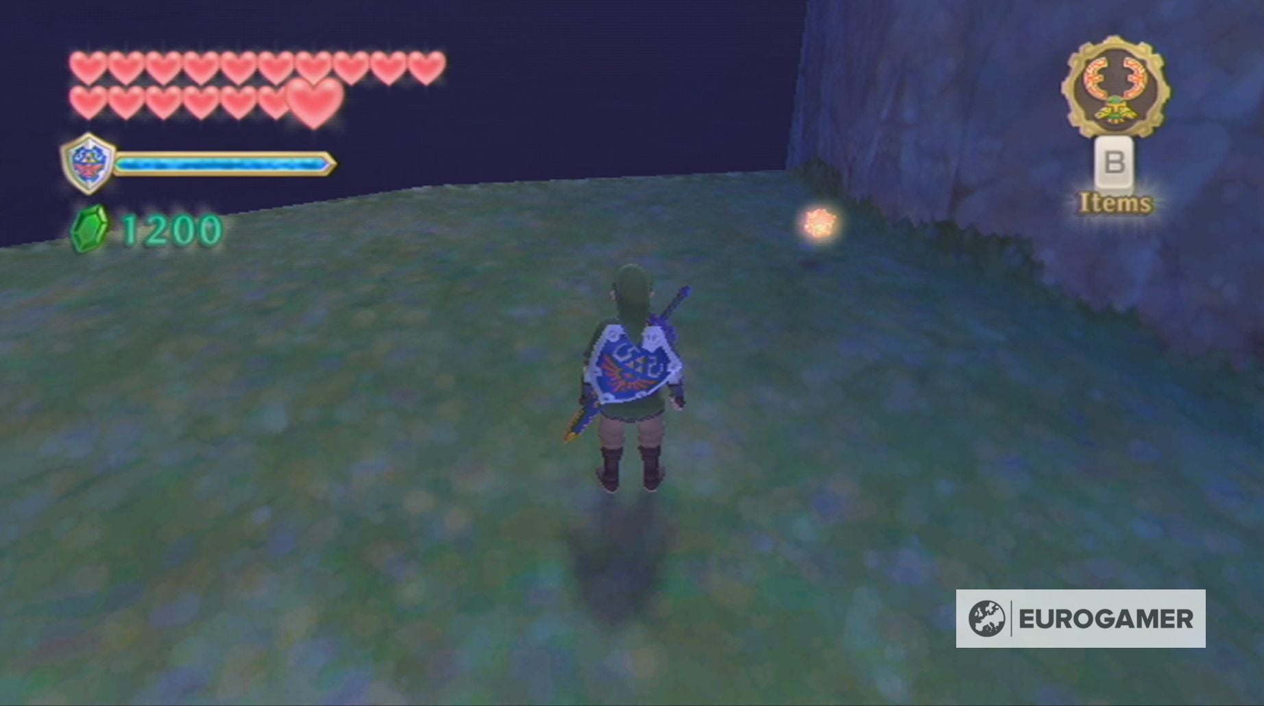 Als je de laatste twee Dankbaarheidskristallen op Skyloft wilt vinden, ga dan in de Watervalgrot naar waar Ganderd Links Rode Loftwing had verstopt.
