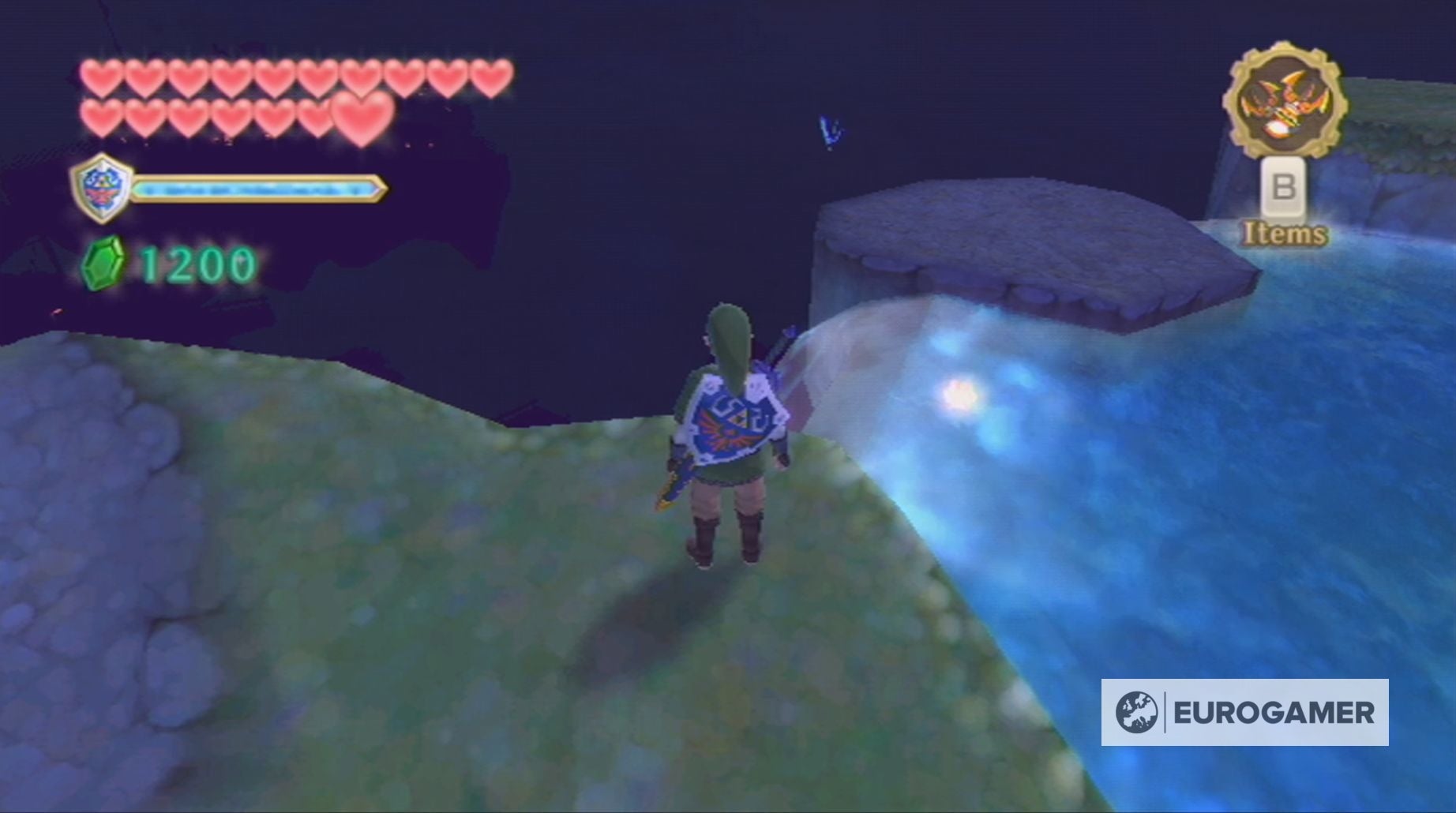 Om het tiende Dankbaarheidskristal op Skyloft te vinden, moet je er eerst, opnieuw, zeker van zijn dat je de Grijpklauwen hebt. Als dat zo is, ga dan naar de ingang van de Watervalgrot en daar zie je een reeks ranken die je kunt beklimmen met je Grijpklauwen
