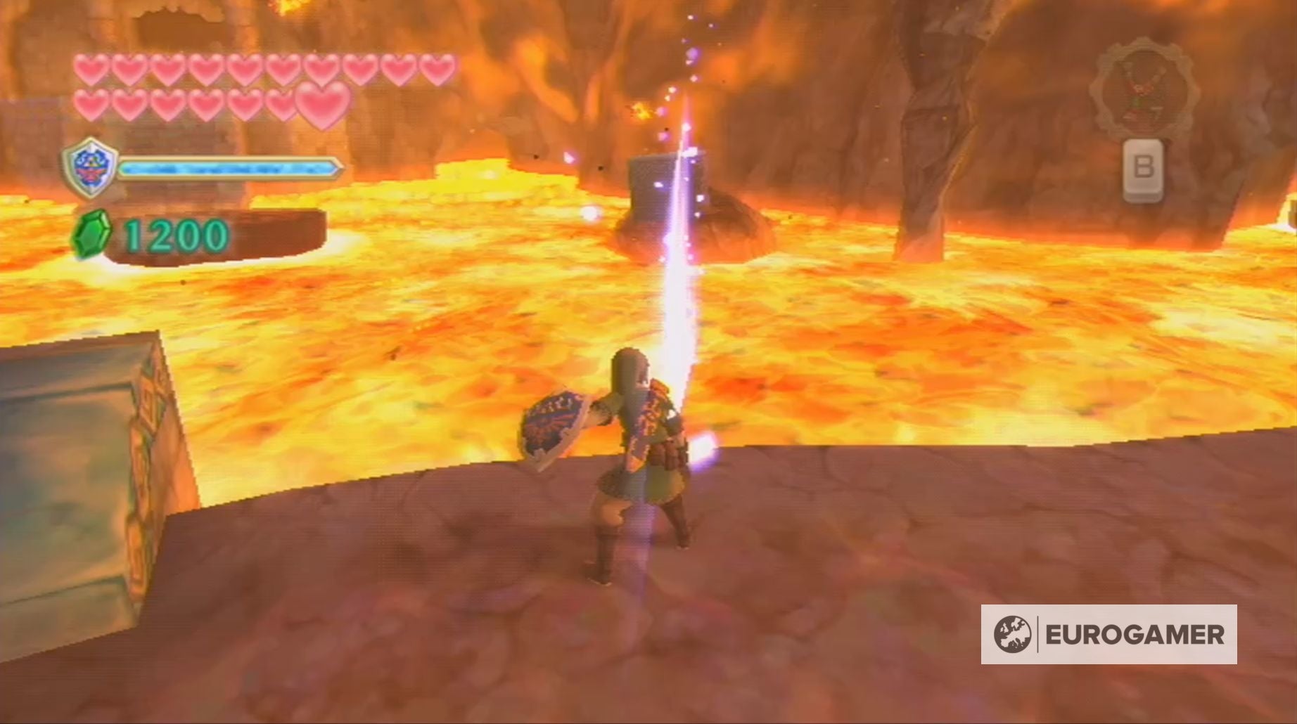 De makkelijkste manier om het blok te activeren is door de Hemelstraal uit te voeren, terwijl je op een van de bewegende stenen staat, maar als je liever een veiligere optie zoekt, heb je de mogelijkheid om met een beetje oefening het blok te raken vanaf de kant waar je de grot binnenkomt. Hoe dan ook, zorg ervoor dat je eerst de Fire Keese en Cursed Spumes afmaakt.