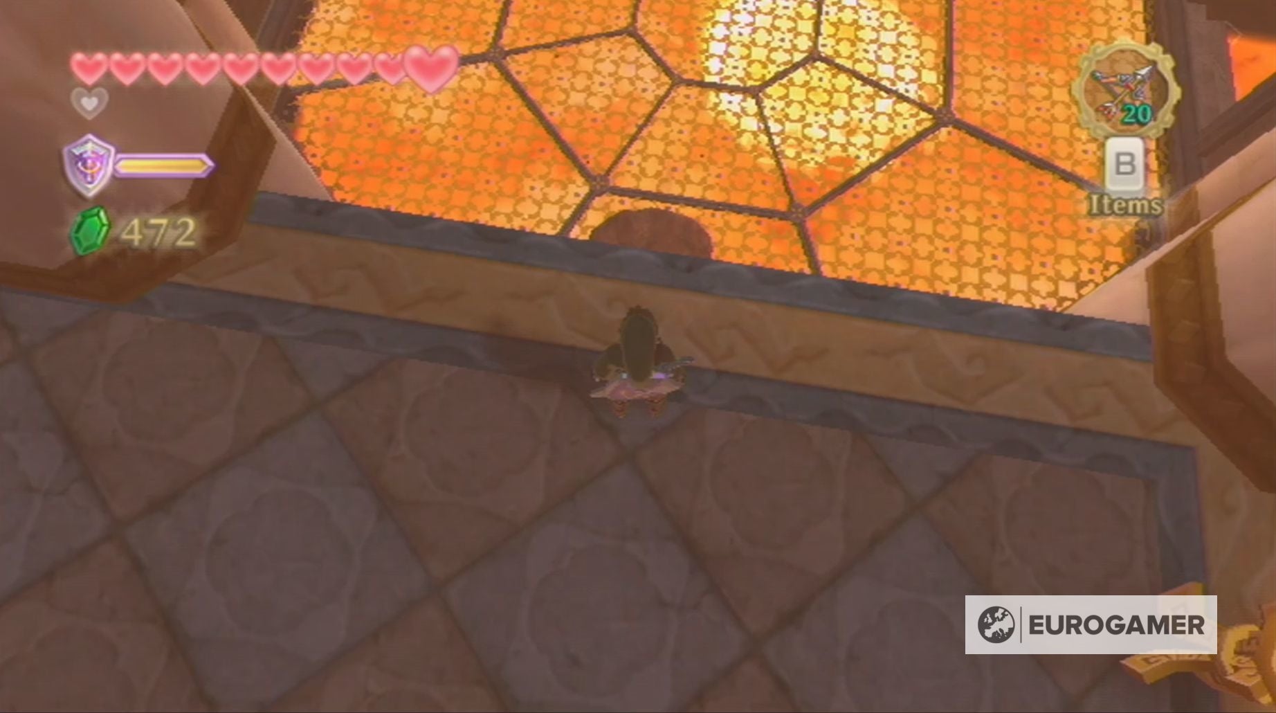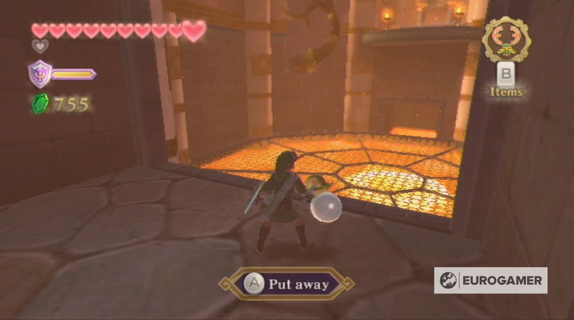 Met de Mogma Handschoenen aan, moet je terugkeren naar de eerste ronde kamer van de kerker, die zich dicht bij de ingang van de kerker bevindt. Ga vervolgens naar de bovenste verdieping van deze kamer. Gebruik daarna de lava hand om het platform te verplaatsen en klim op de lianen, totdat je de ruimte bereikt waar een standbeeld van een vogel staat.