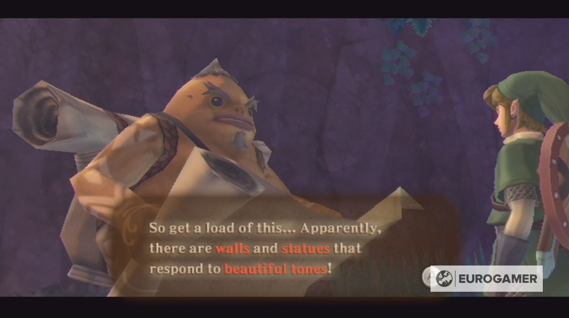 Als je klaar bent, keer dan terug naar het Faron-woud en, als je wilt, kun je een praatje maken met de Goron-archeoloog om meer informatie te krijgen over de Godinnenmuren en Roddelrotsen.