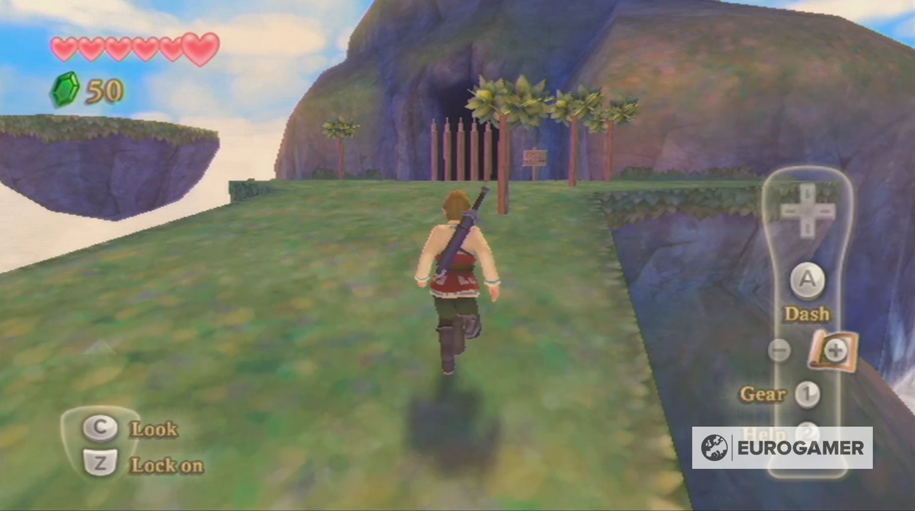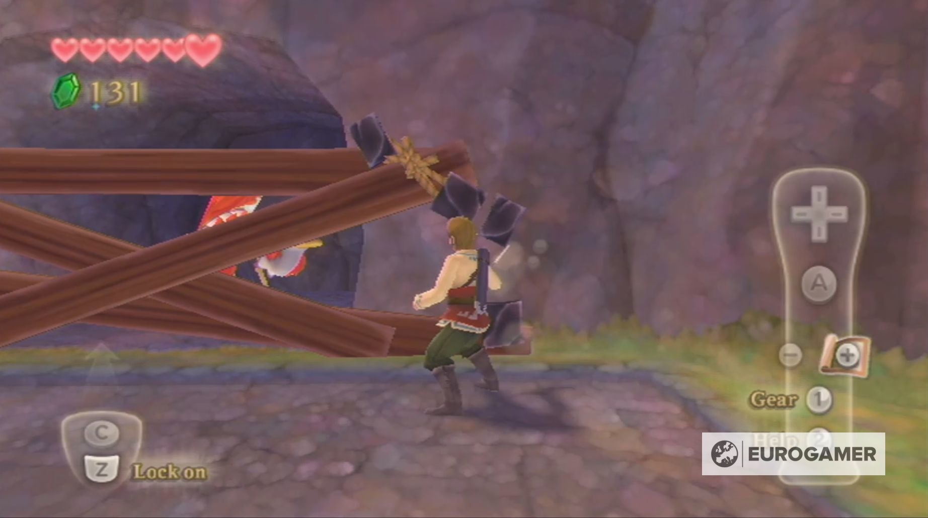 Na het verlaten van de grot ben je herenigd met Zelda die wat afgeleid lijkt. Samen met haar ga je verder en al gauw ontdek je de Rode Loftwing die opgesloten zit achter planken.