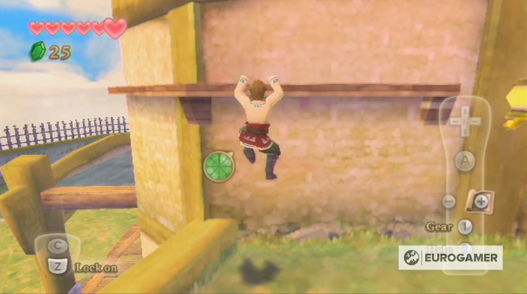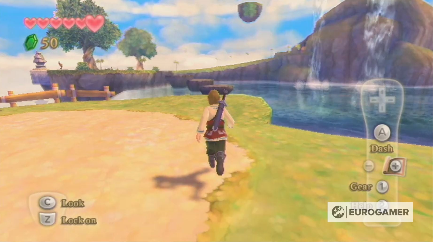 Met het zwaard in de hand, ga je naar Skyloft's meer en spring je over de rotsen om de andere kant te bereiken. Laat je niet in het water vallen want je zou wel eens kunnen meegesleurd worden door het water en van Skyloft af kunnen drijven.