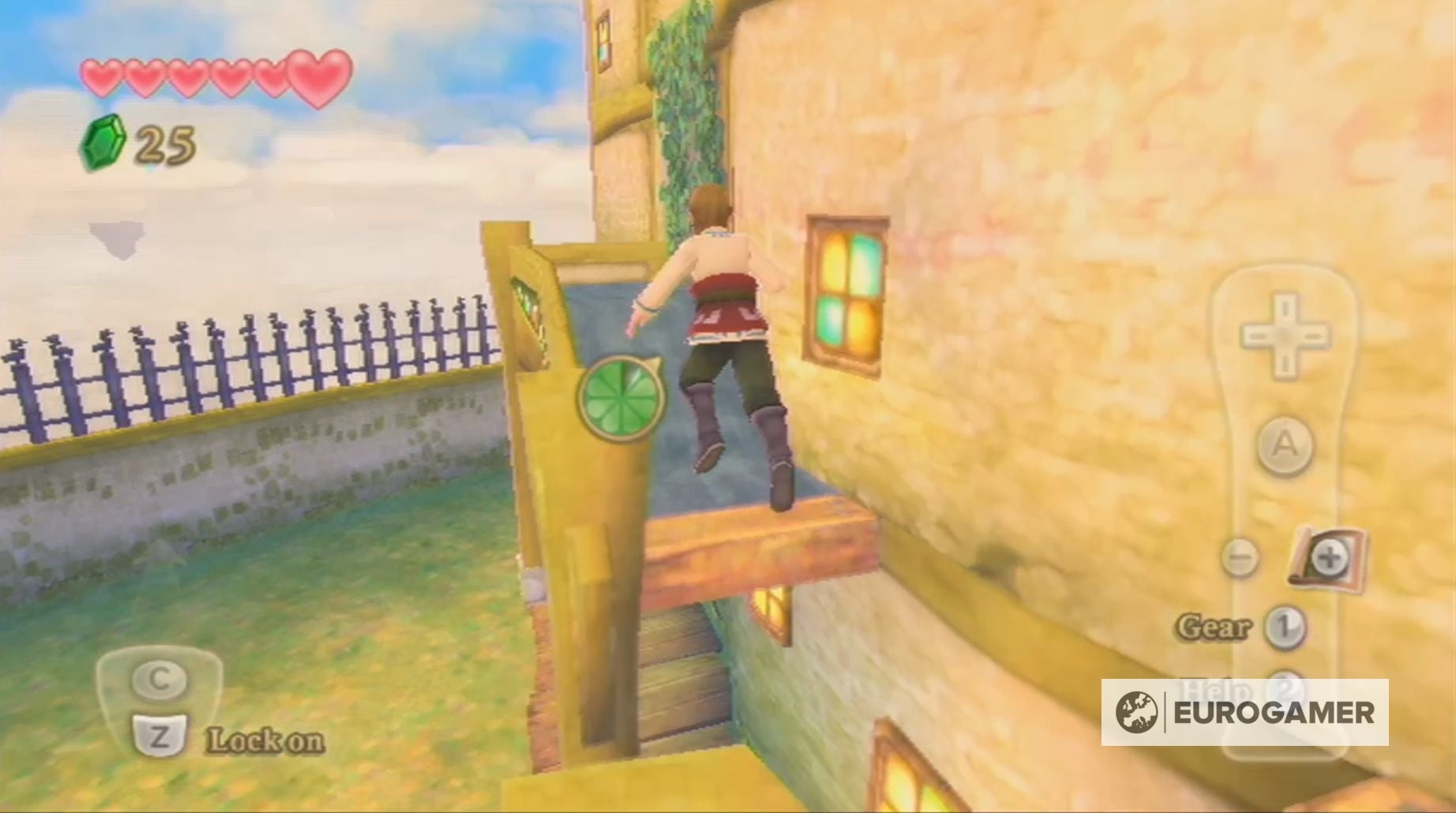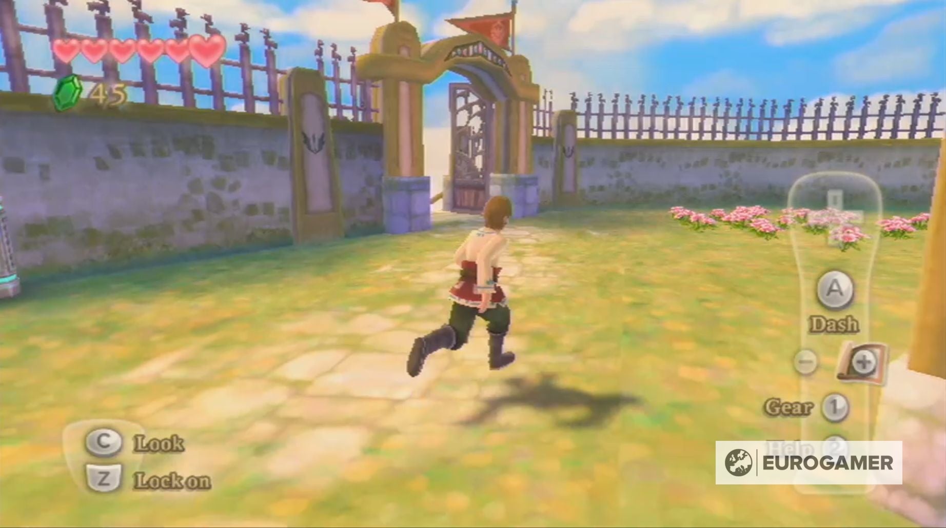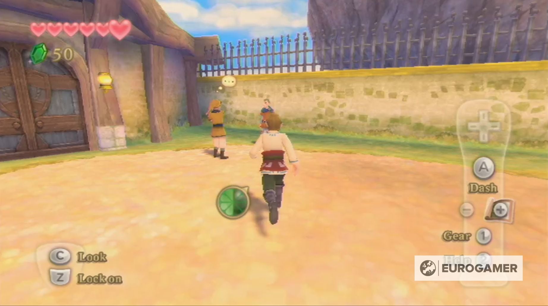 Tijdens je wandeling naar het grote plein wordt je ook gestopt door Mewus, die je zal leren rollen in Skyward Sword.