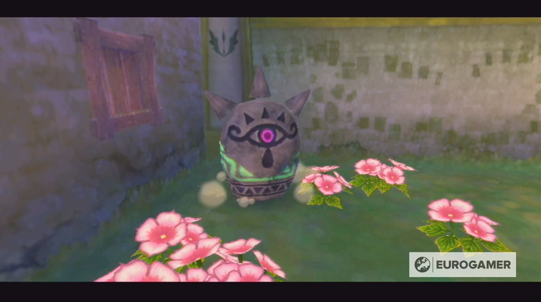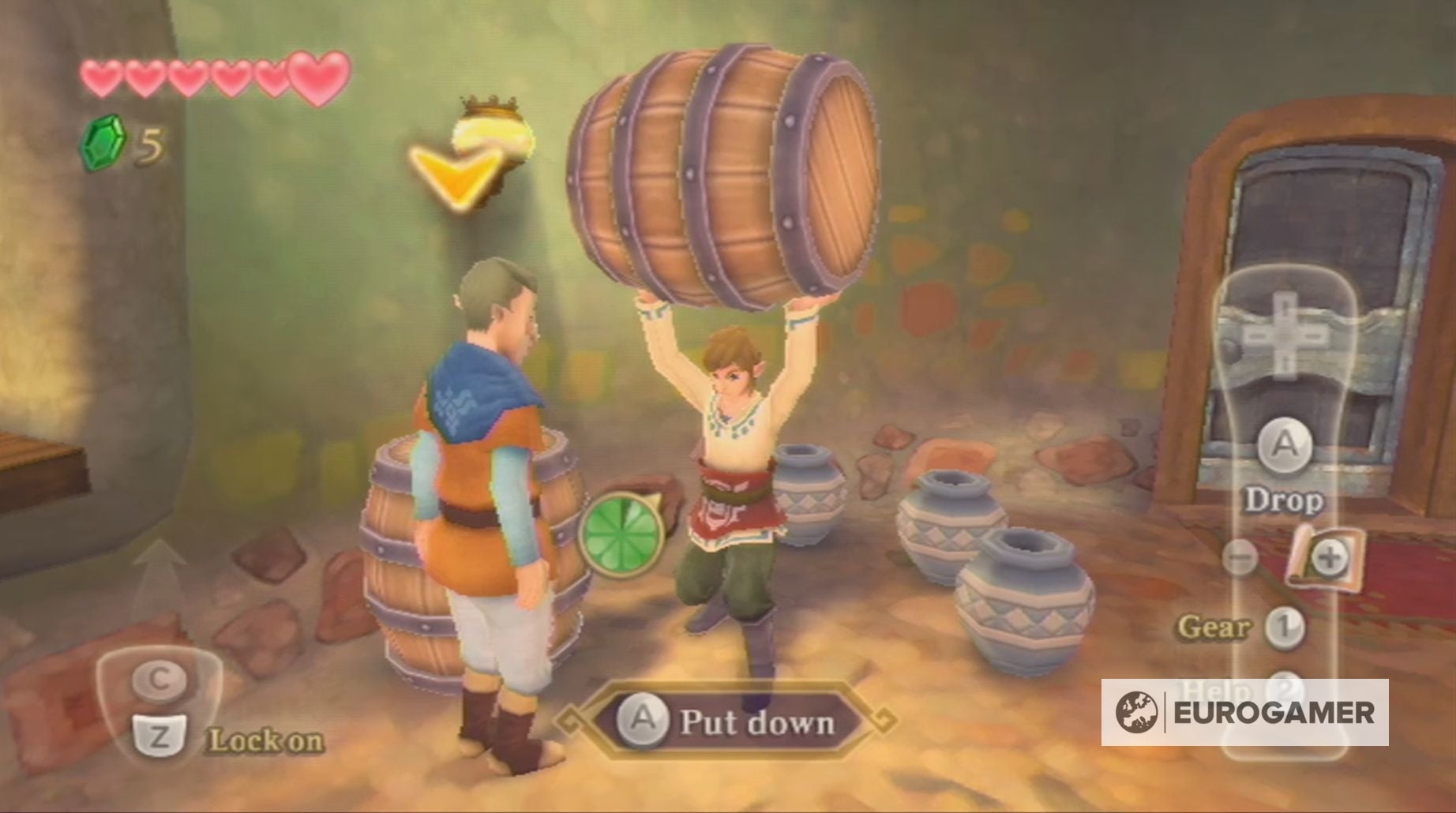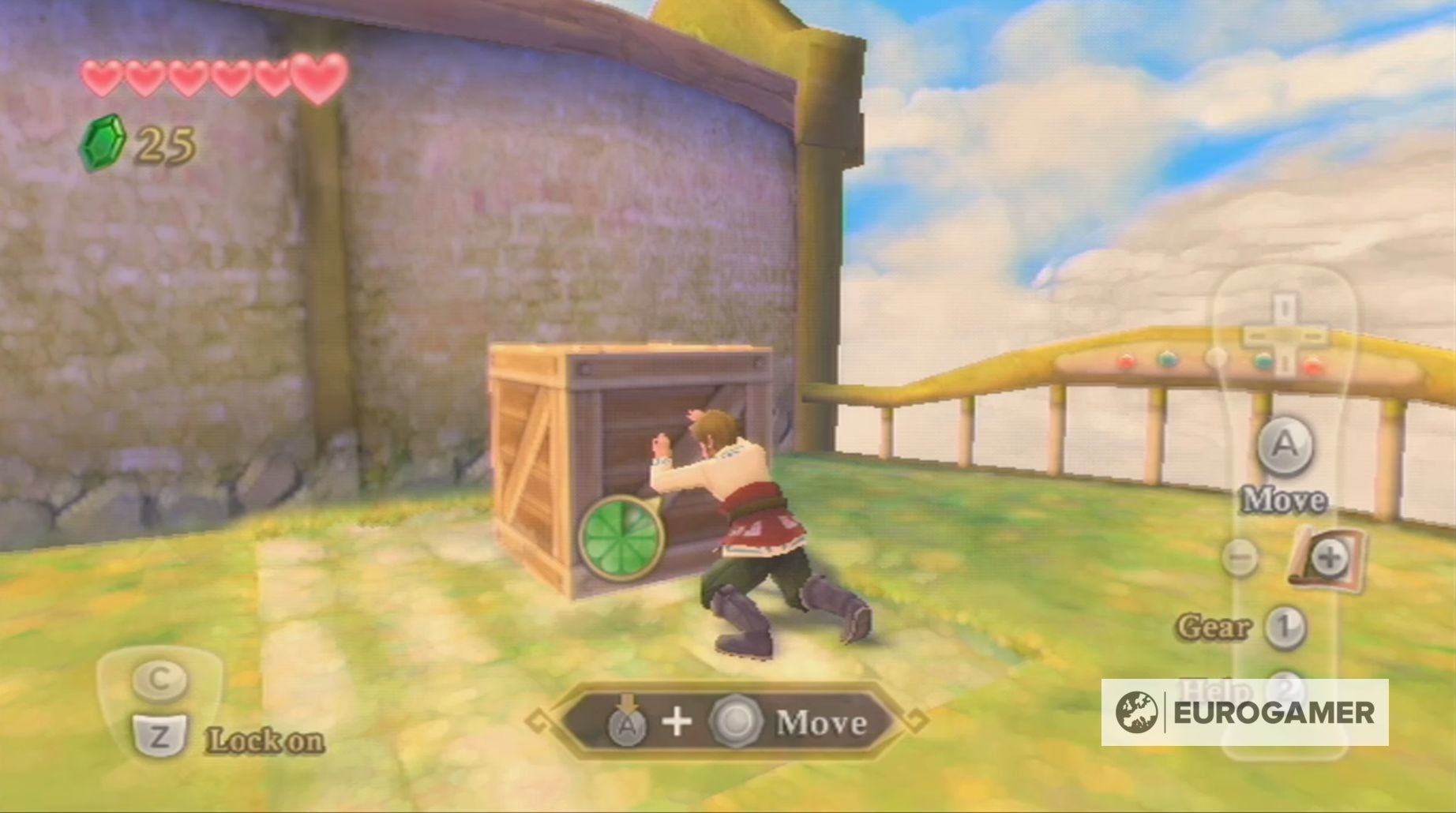 Tijdens je wandeling naar het grote plein wordt je ook gestopt door Mewus, die je zal leren rollen in Skyward Sword.