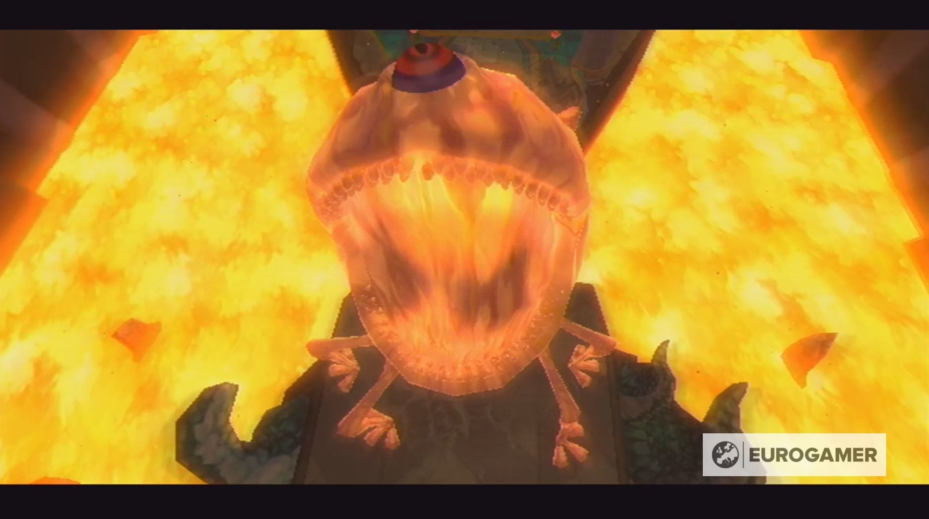 Dit is het signaal om een bom in Scaldera's mond te gooien. Hiermee vernietig je wat van de rotsen die zijn oog beschermen.