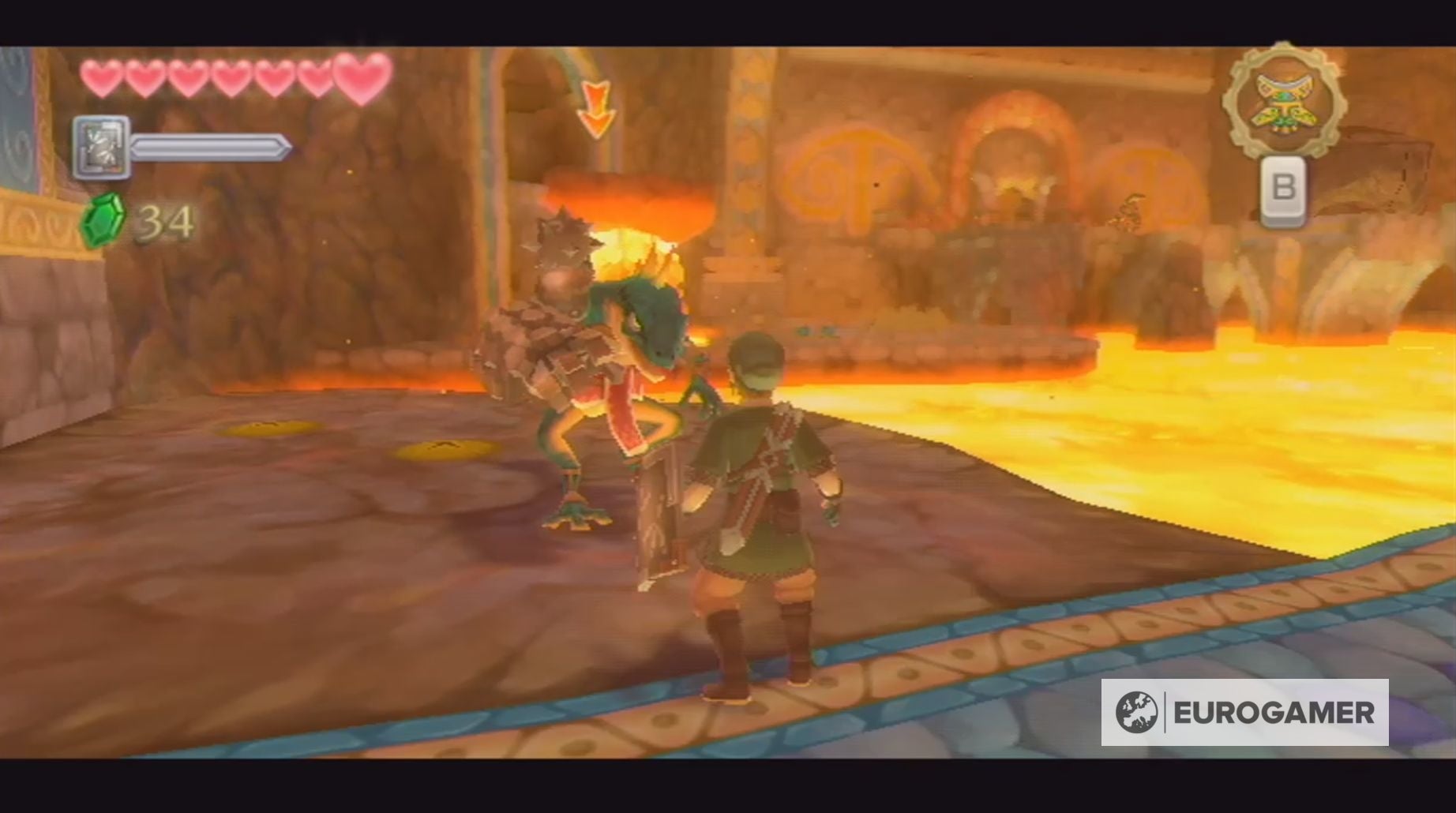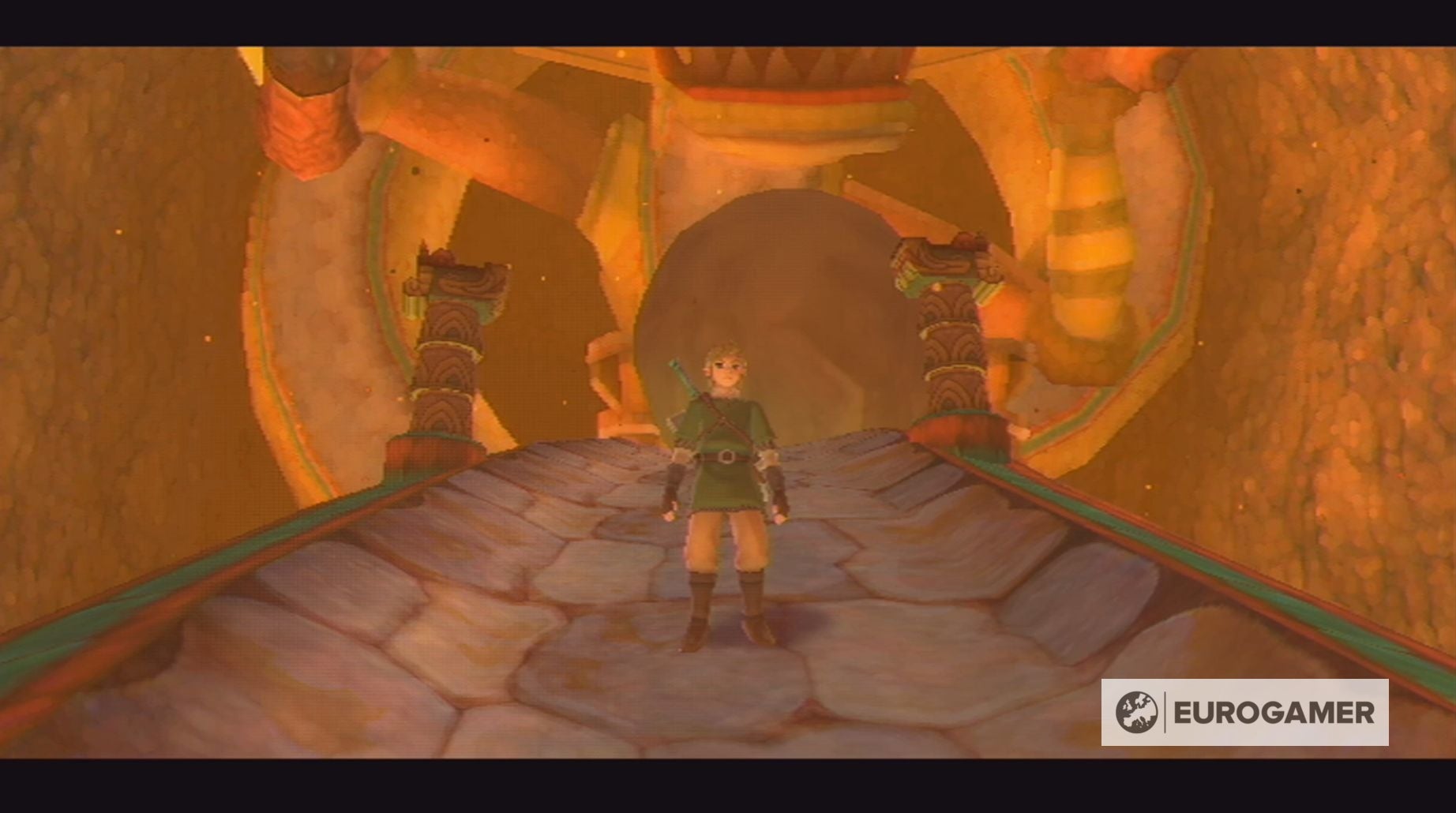 Sla je spel op en bereid je voor om te vechten tegen de Tempel der aarde baas: Scaldera. Door Scaldera te verslaan kun je naar de derde regio gaan: Lanayru-woestijn en Lanayru's mijnbouwcentrum.
