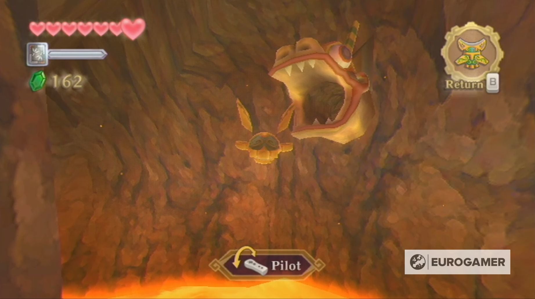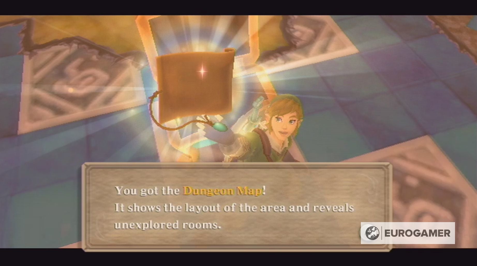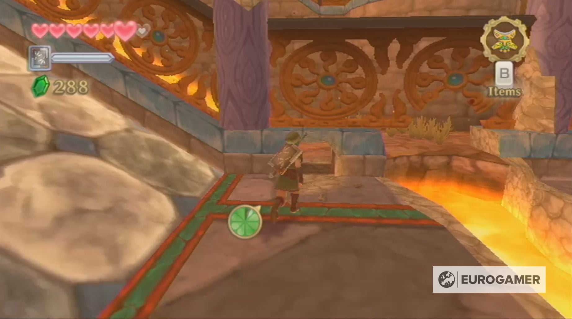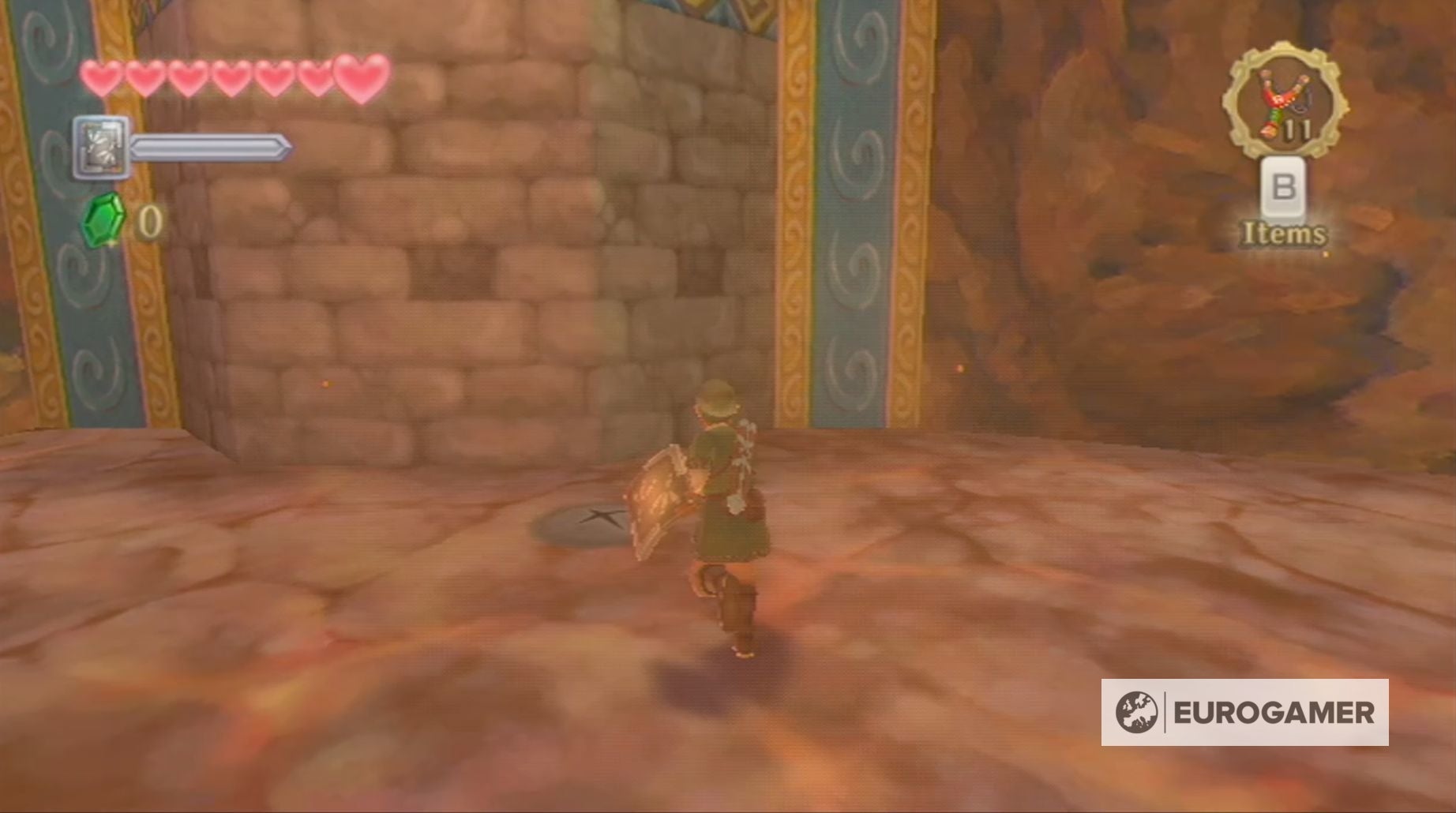 Je volgende opdracht in Skyward Sword is de sleutel voor de baas van de Tempel der Aarde te vinden. Gelukkig is de kaart hier een goede hulp in en kan je zien op de kaart dat er een zwakke plek aangeduid staat op een muur. Deze plek bevindtd zich op de muur recht tegenover het vogelstandbeeld op het centrale platform.