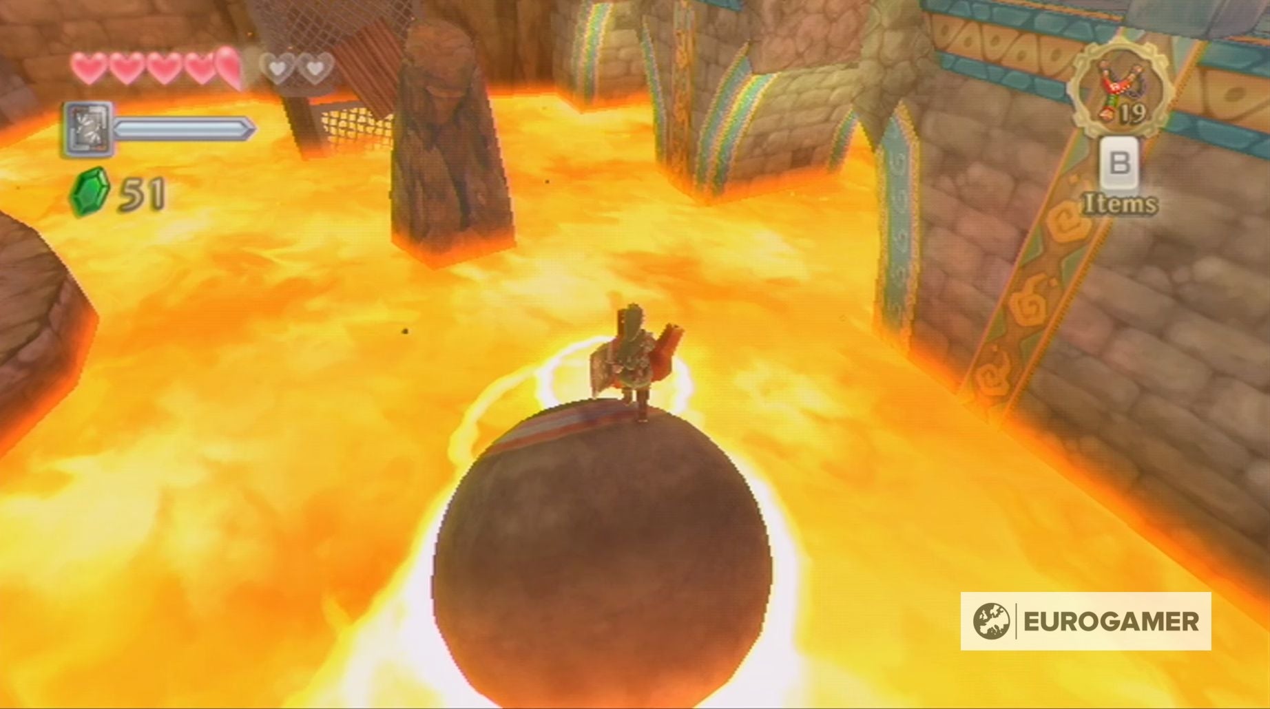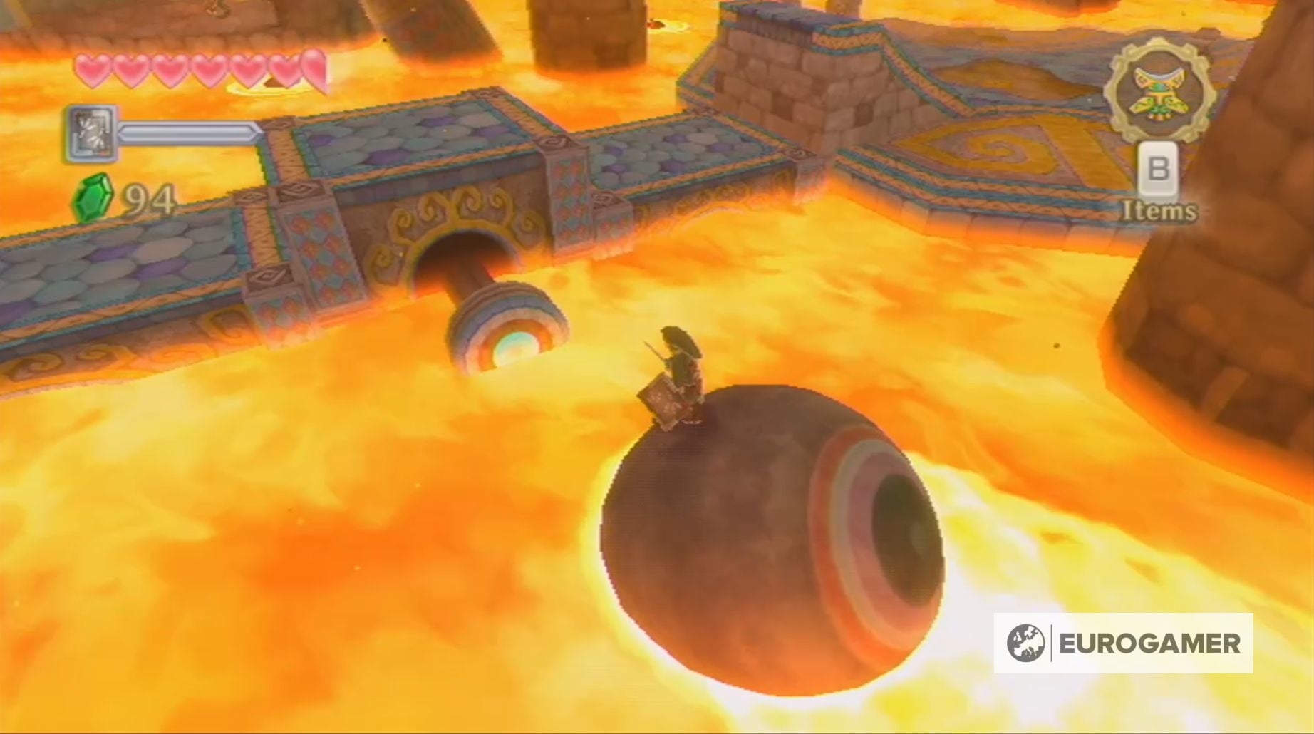 Vervolgens moet je op de bal rollen door het geopende gedeelte. Versla de Magma Spume en ga de grot in aan je rechterzijde als je wat meer bommen nodig hebt.