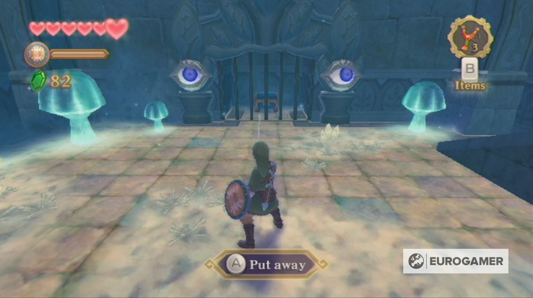Zodra de Skulltula dood is, moet je Link op de plek zetten waar beide ogen open zijn, en dan met de zwaard zwaaien totdat beide ogen op de grond vallen. Dit geeft je toegang tot de kist met de kleine sleutel.