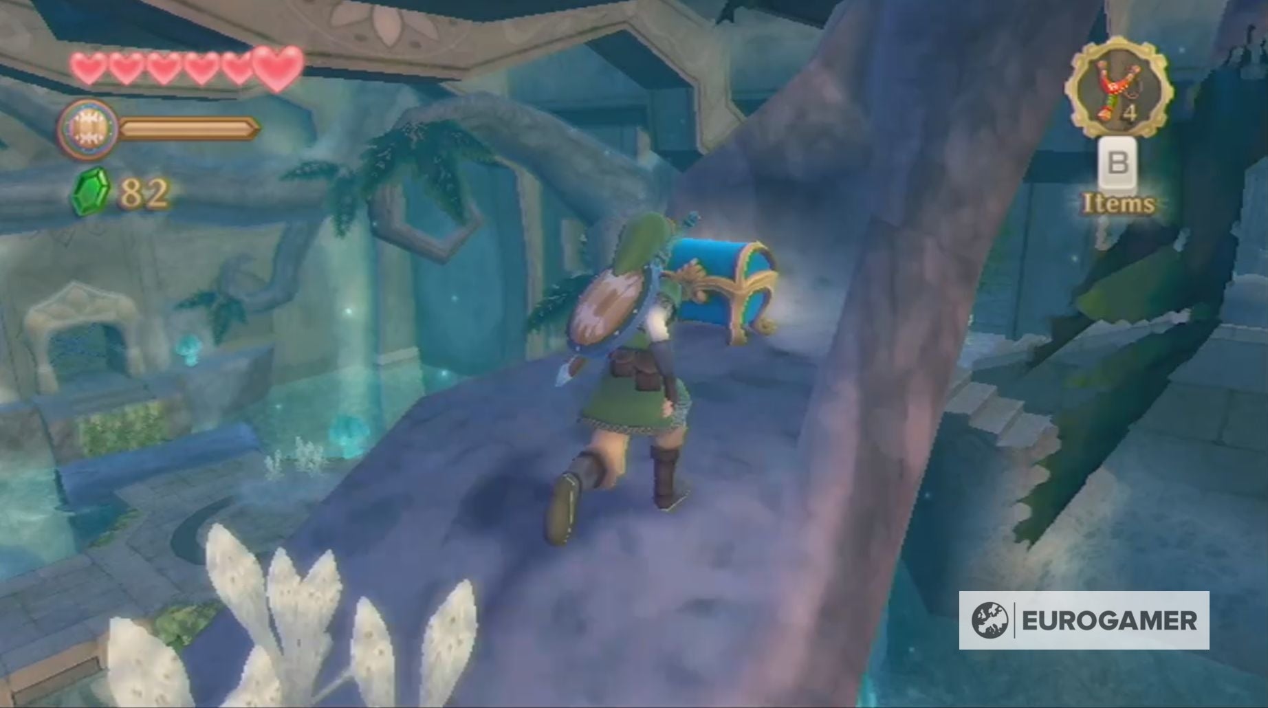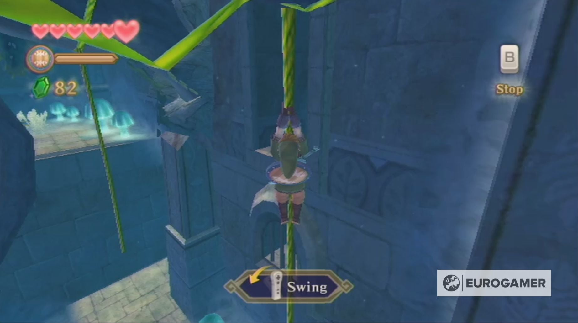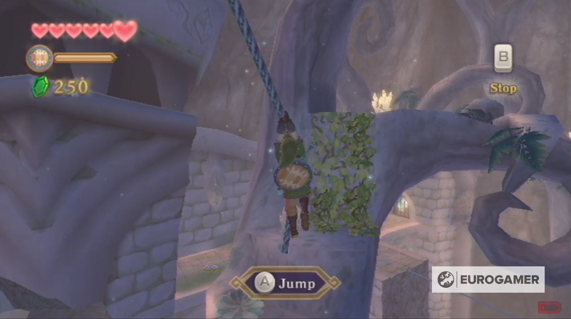 Spring naar de eerste liaan en klim er een beetje op, zodat je Link veilig op de richel aan de rechterkant kunt slingeren. Daar vind je een edelsteen dat je moet raken waardoor er ook water in deze kamer komt.