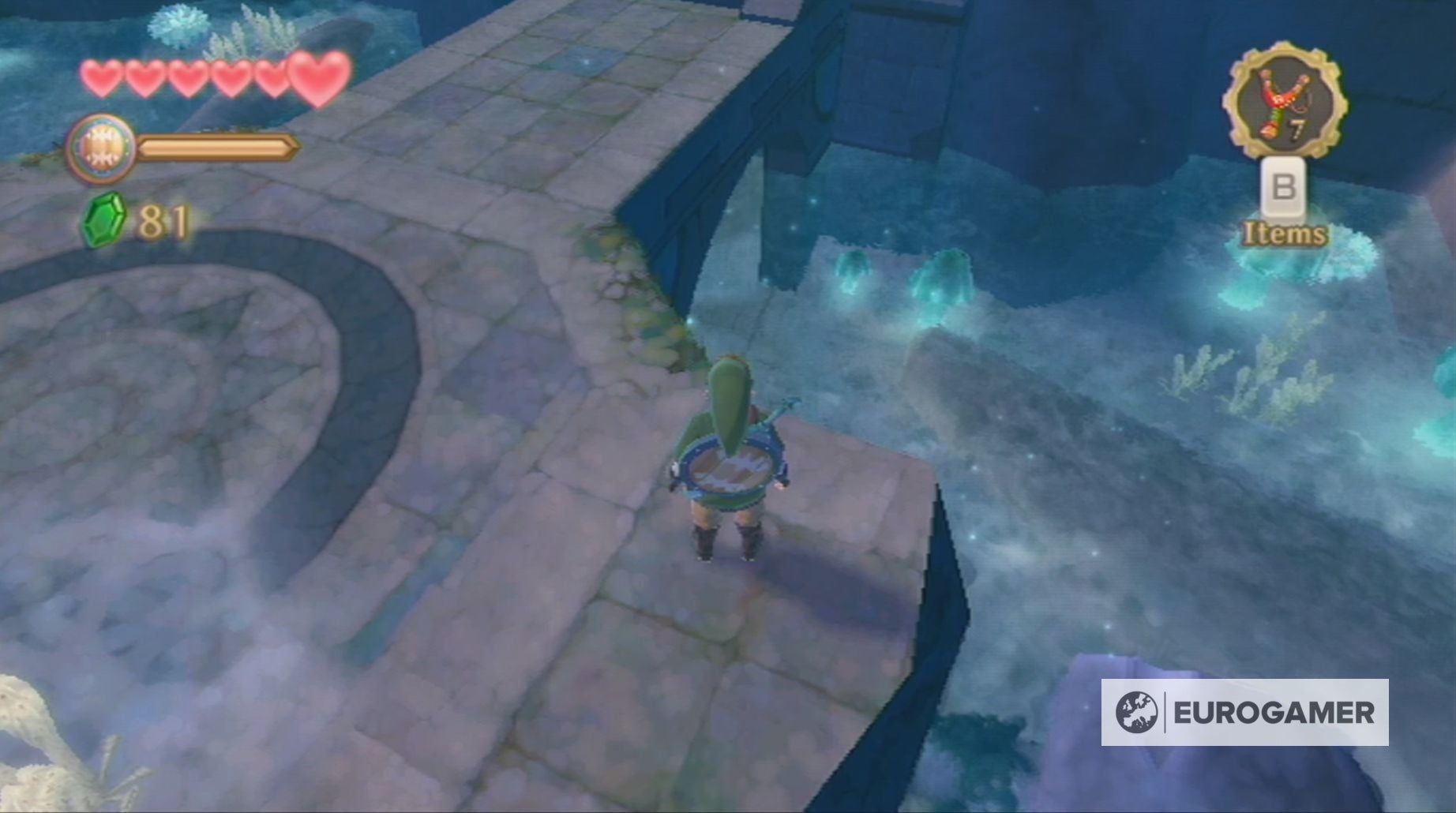 Je volgende opdracht in Skyward Sword is het vinden van een kleine sleutel, zodat je verder de Tempel der Bezinning in kunt gaan. Allereerst, spring je in het water onder je en ga je naar de rechterkant van de hoofdkamer.