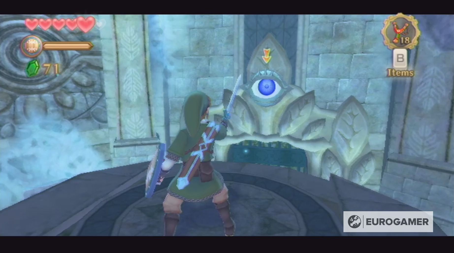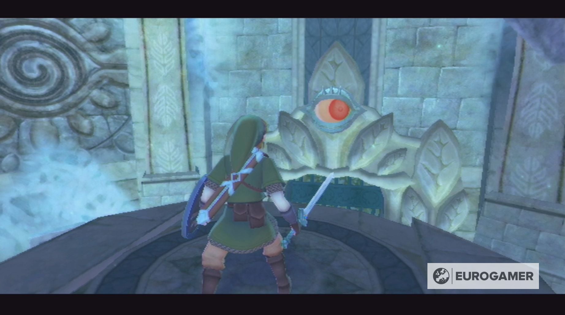 Ga deze nieuwe kamer in en klim op het platform, zodat je tegenover het oog staat. De makkelijkste manier om deze puzzel op te lossen is door op het oog te richten en dan je zwaard te gebruiken, tot het verward raakt en op de grond valt.