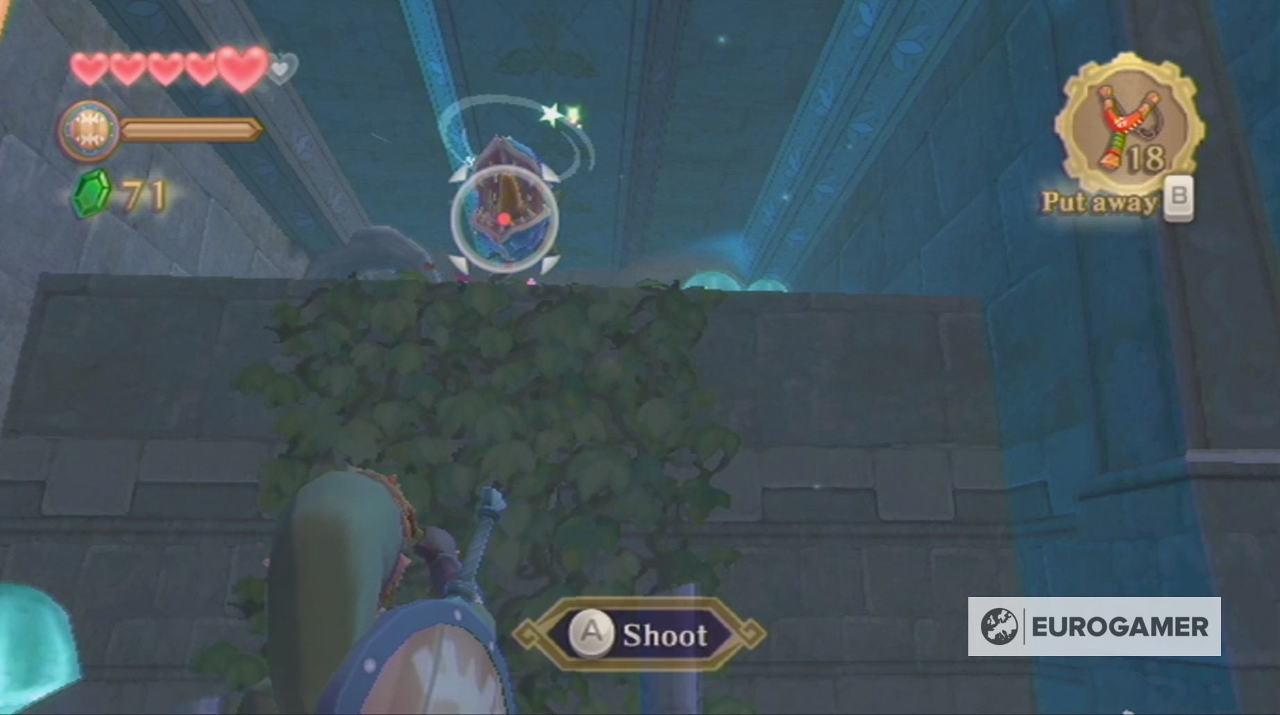 Als je klaar bent, raak je de edelsteen boven de rechterdeur met je Katapult en ga je de kamer eronder in.